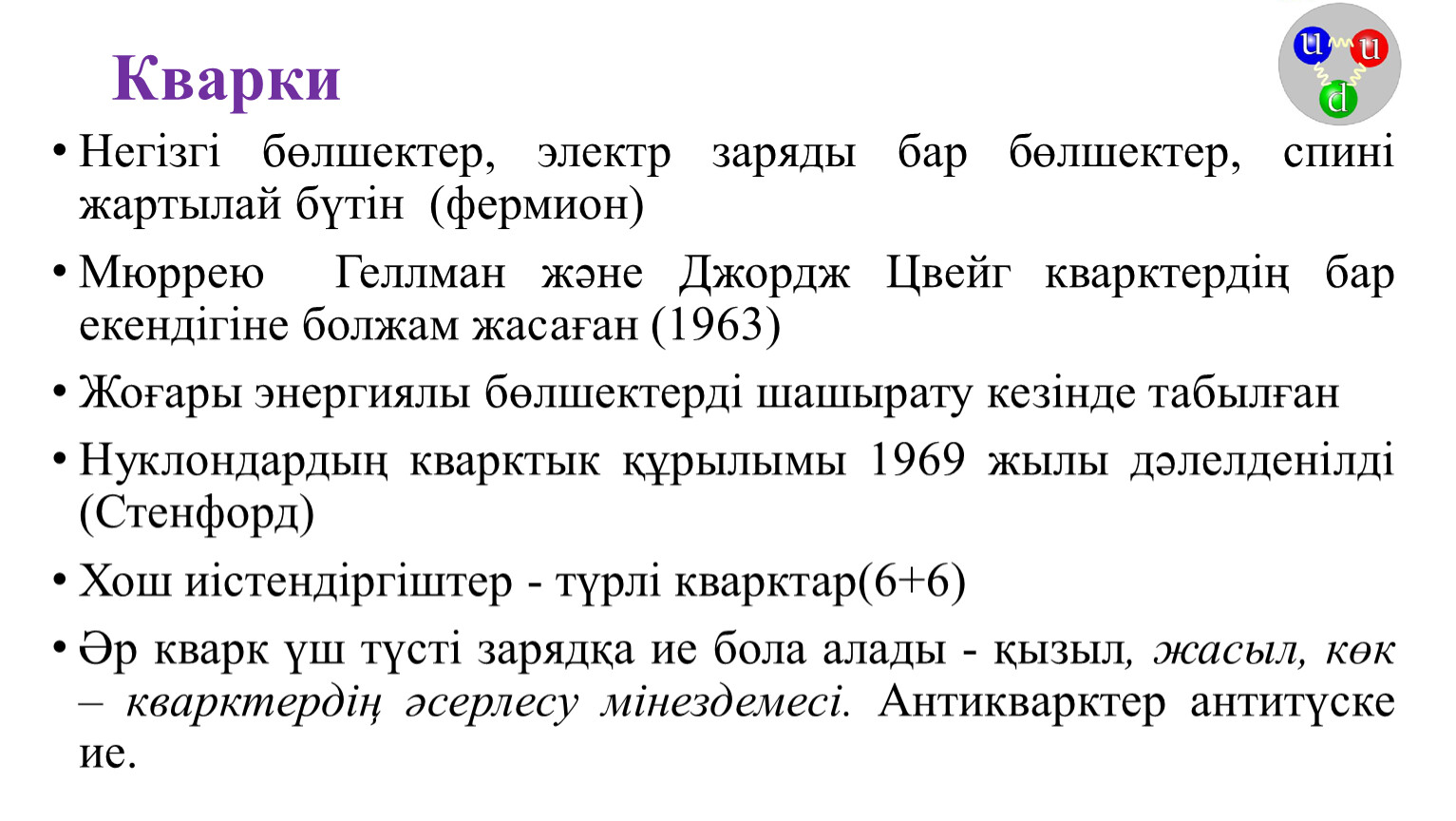 Нуклондардың кварктык құрылымы 1969 жылы дәлелденілді (Стенфорд)