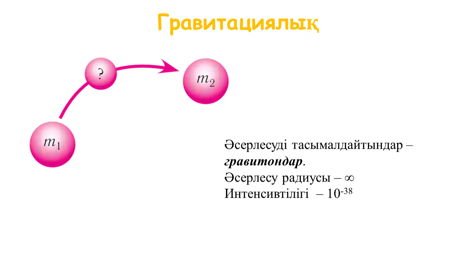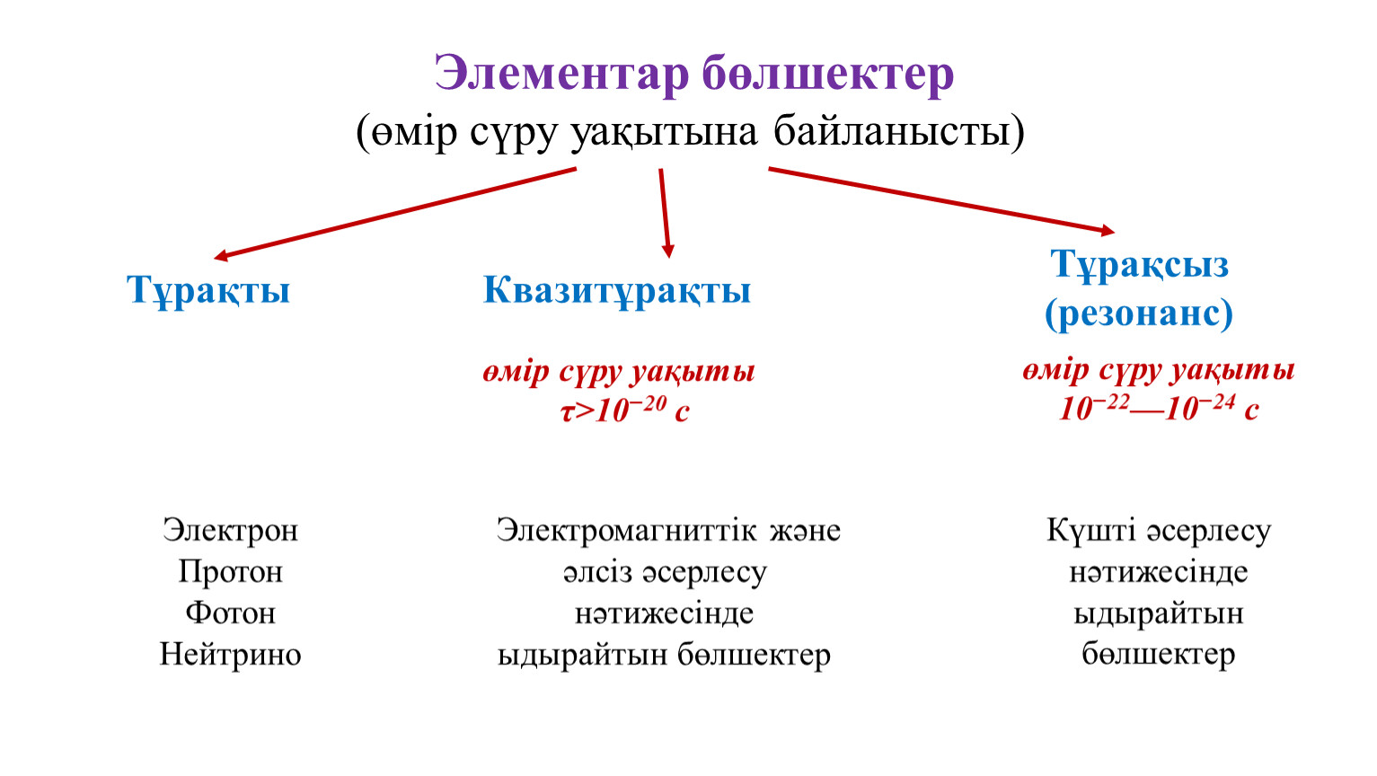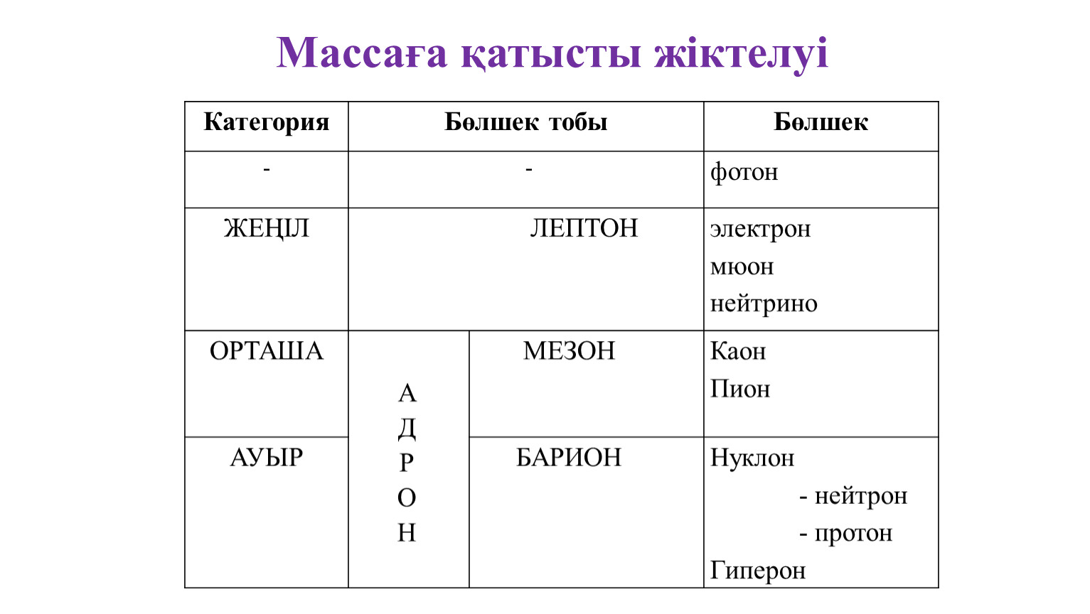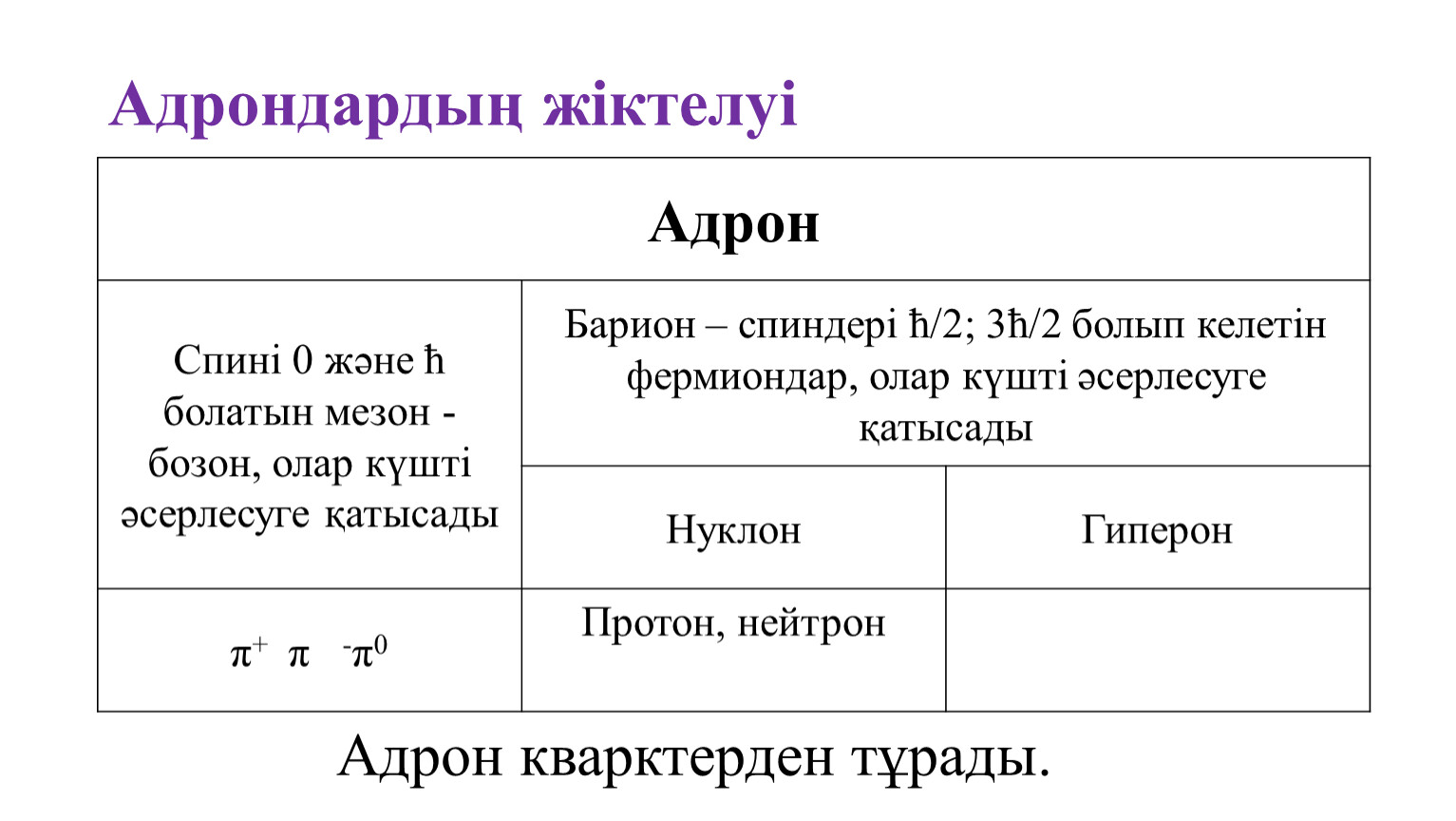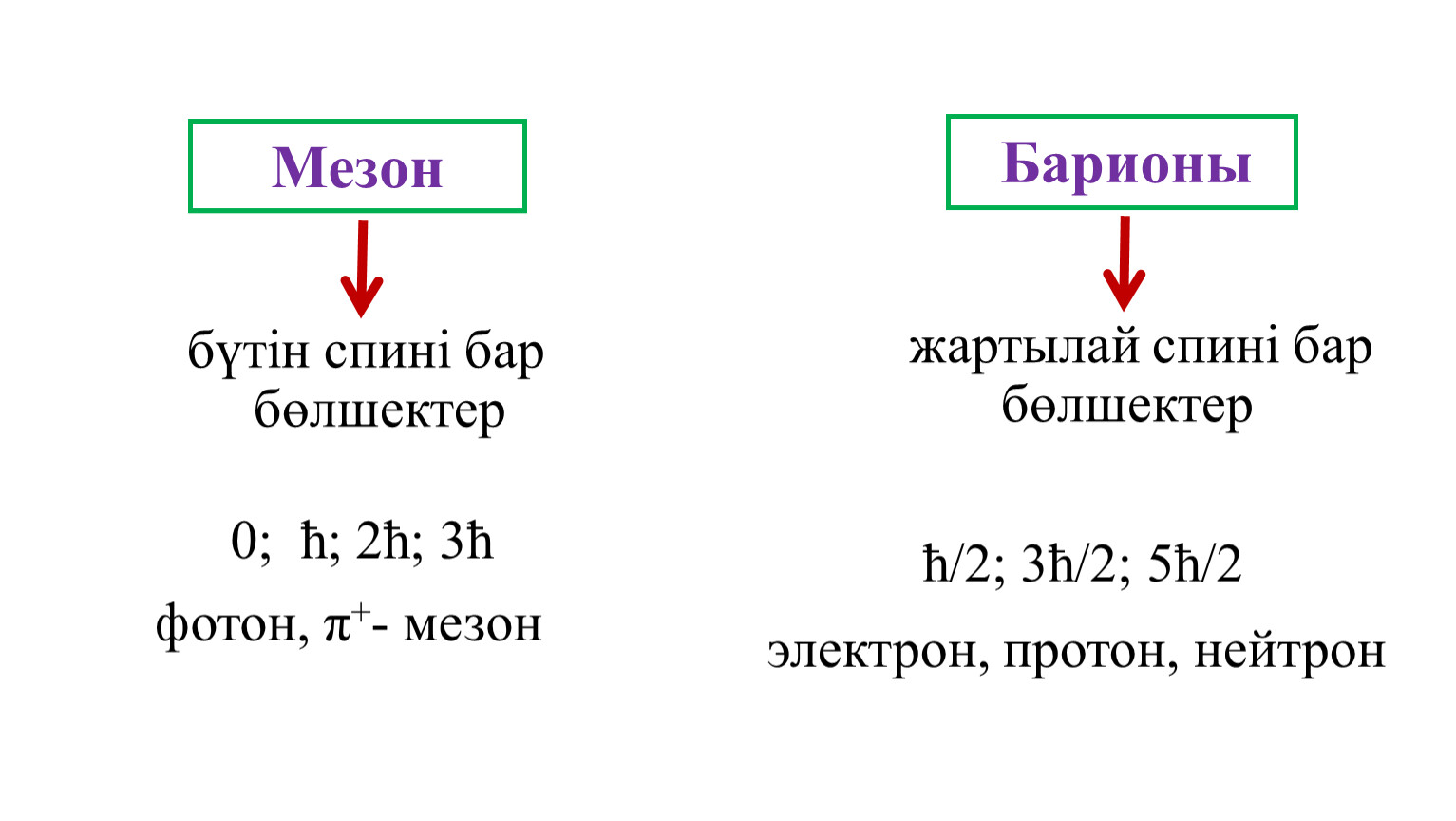 Спині 0 және ħ болатын мезон - бозон, олар күшті әсерлесуге қатысады | Барион – спиндері ħ/2; 3ħ/2 болып келетін фермиондар, олар күшті әсерлесуге қатысады | |