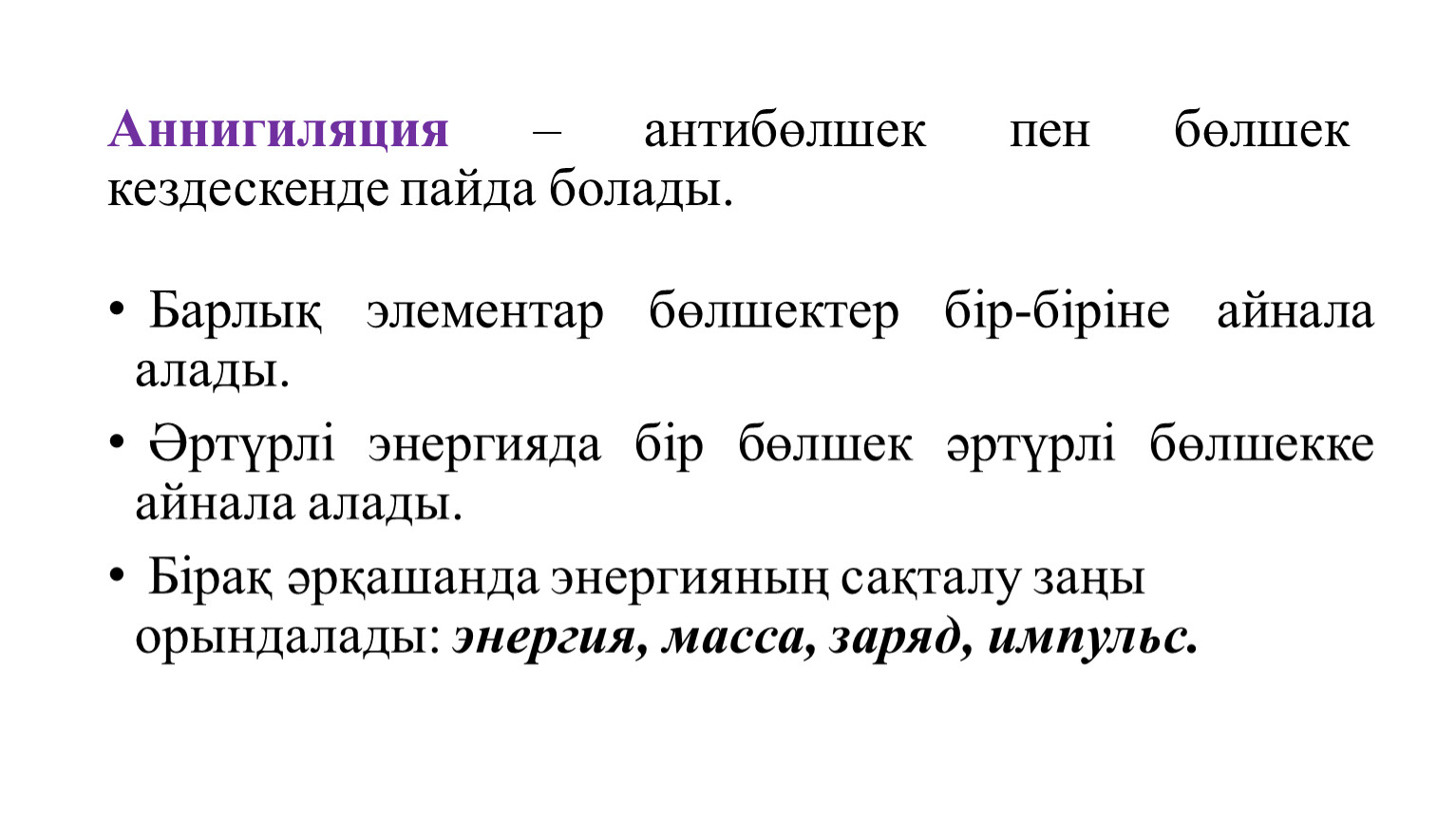 Аннигиляция – антибөлшек пен бөлшек кездескенде пайда болады.