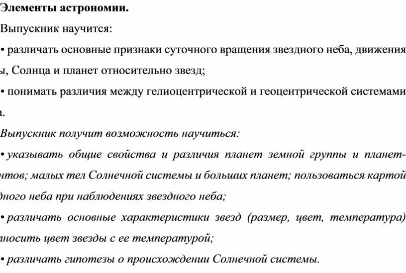 • указывать общие свойства и различия планет земной группы и планет-гигантов; малых тел Солнечной системы и больших планет; пользоваться картой звездного неба при наблюдениях звездного неба;