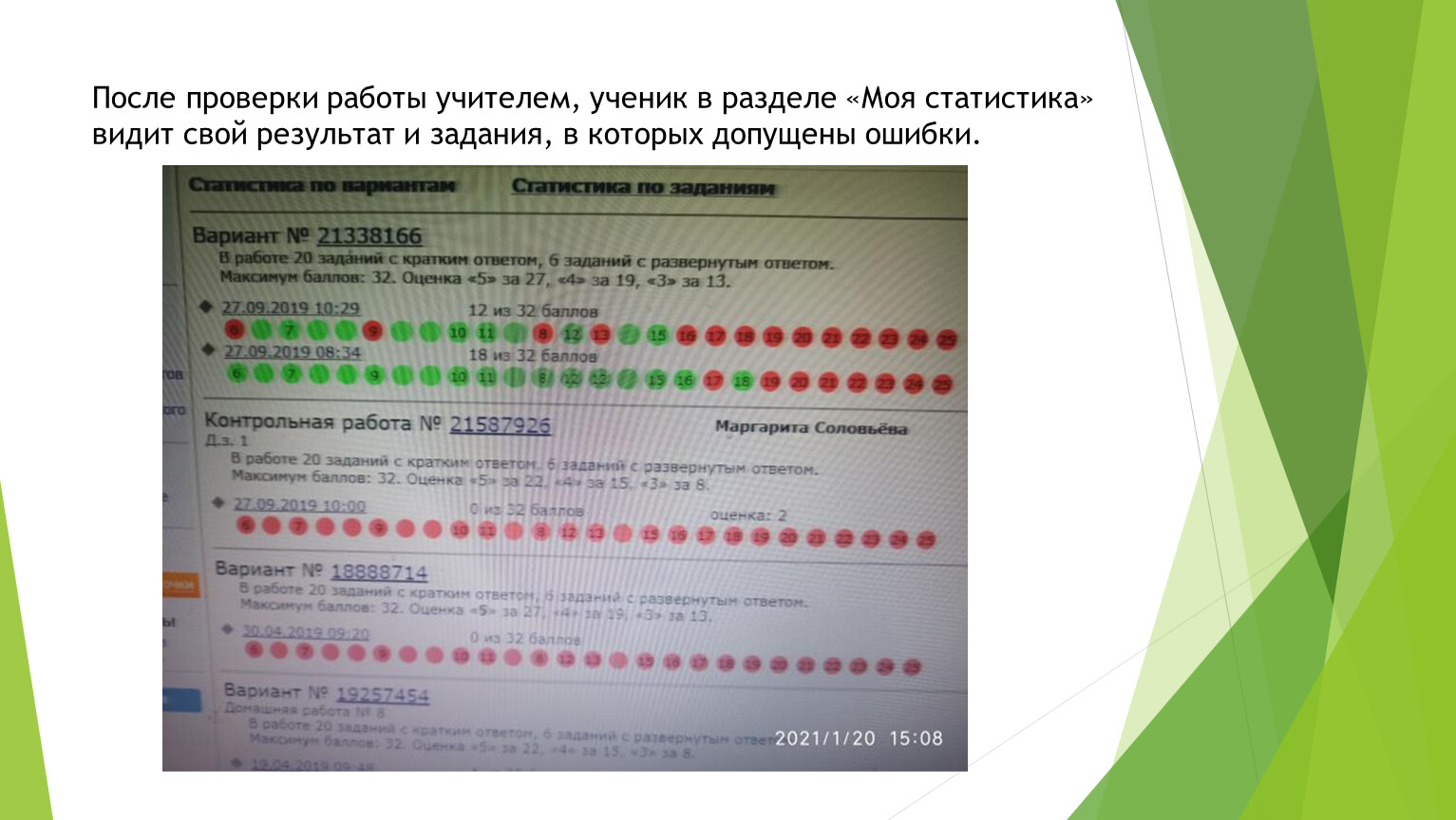 После проверки работы учителем, ученик в разделе «Моя статистика» видит свой результат и задания, в которых допущены ошибки.