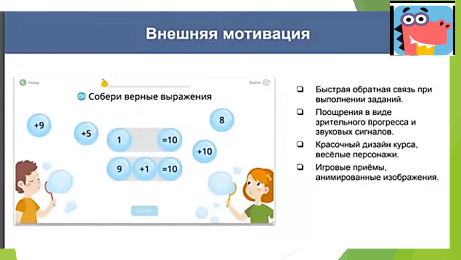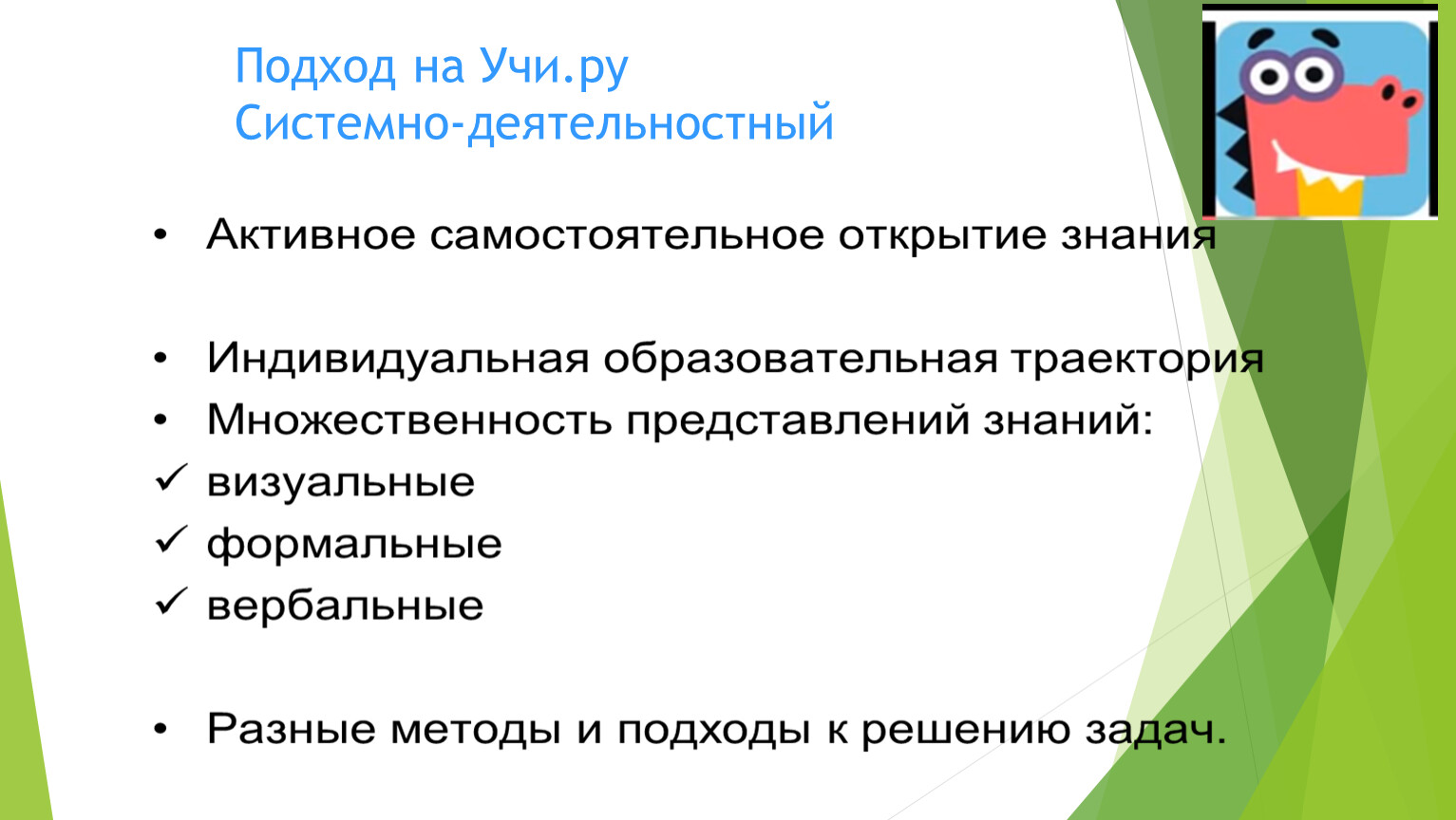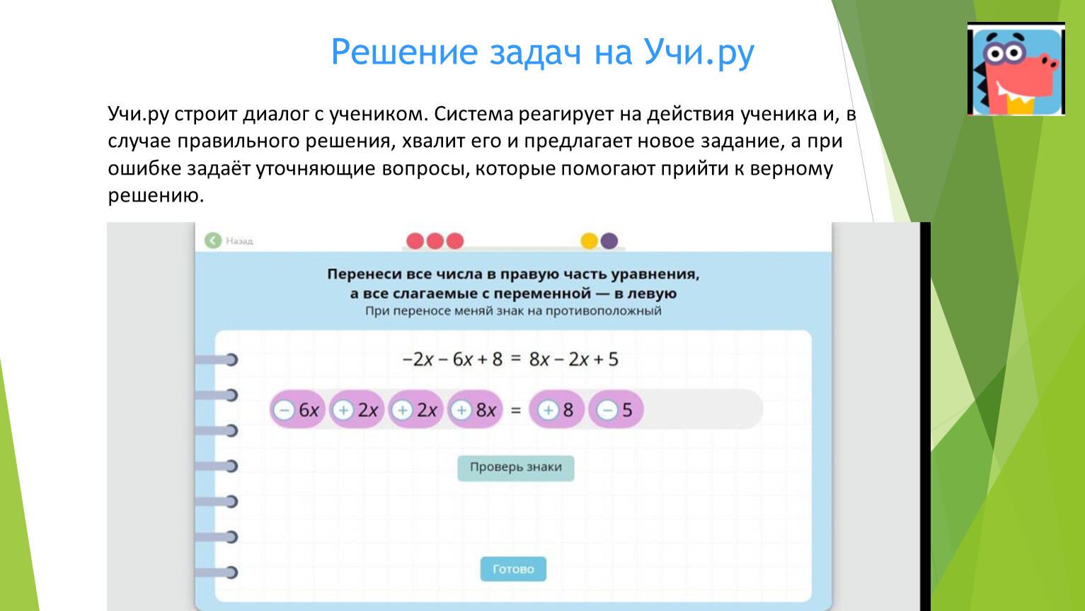 Учи.ру строит диалог с учеником. Система реагирует на действия ученика и, в случае правильного решения, хвалит его и предлагает новое задание, а при ошибке задаёт уточняющие вопросы, которые помогают прийти к верному решению.