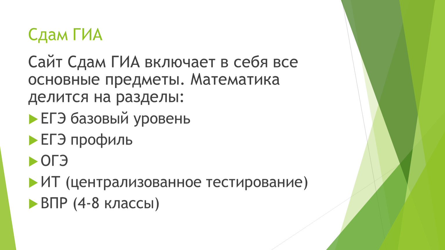 Сайт Сдам ГИА включает в себя все основные предметы. Математика делится на разделы:
