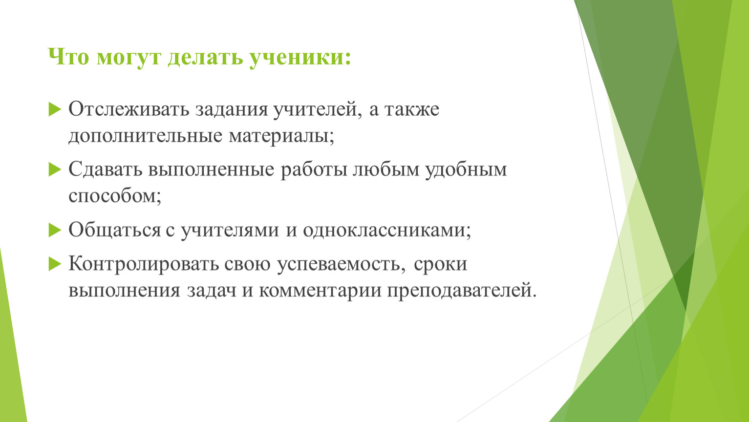 Возможность общения. Вы можете обсуждать задания с преподавателями и учащимися, комментировать (учителя) и видеть комментарии (ученики) к своим работам. При этом вам не нужно использовать электронные письма.