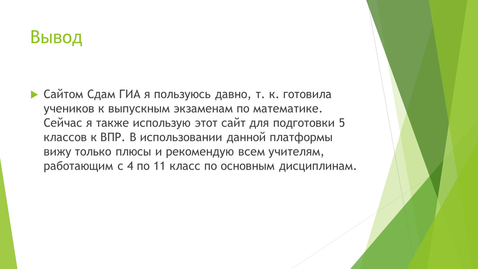 Сайтом Сдам ГИА я пользуюсь давно, т. к. готовила учеников к выпускным экзаменам по математике. Сейчас я также использую этот сайт для подготовки 5 классов к ВПР. В использовании данной платформы вижу только плюсы и рекомендую всем учителям, работающим с 4 по 11 класс по основным дисциплинам.