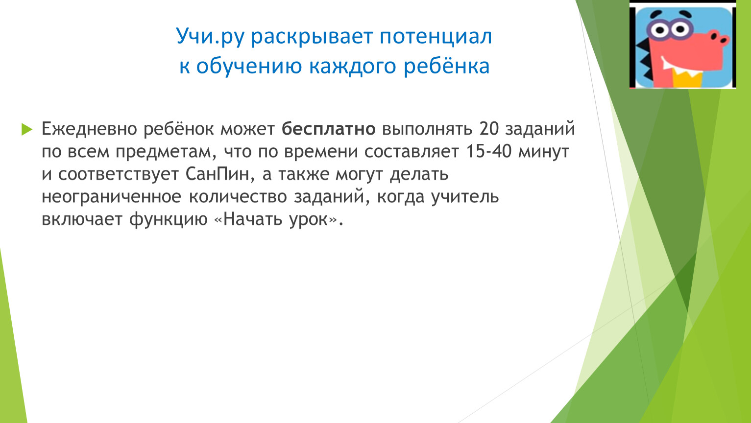 Ежедневно ребёнок может бесплатно выполнять 20 заданий по всем предметам, что по времени составляет 15-40 минут и соответствует СанПин, а также могут делать неограниченное количество заданий, когда учитель включает функцию «Начать урок».