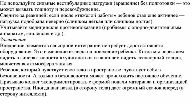 Не используйте сильные вестибулярные нагрузки (вращение) без подготовки — это может вызвать тошноту и перевозбуждение.