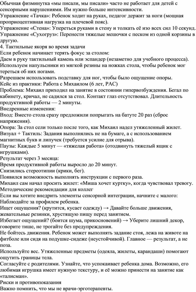 Внедрение элементов сенсорной интеграции не требует дорогостоящего оборудования. Это изменение взгляда на поведение ребенка. Когда мы перестаем видеть в гиперактивности «хулиганство» и начинаем видеть «сенсорный голод», меняется вся атмосфера занятия.