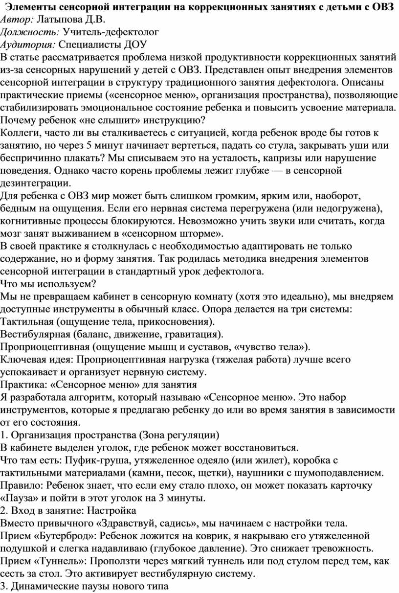 В статье рассматривается проблема низкой продуктивности коррекционных занятий из-за сенсорных нарушений у детей с ОВЗ. Представлен опыт внедрения элементов сенсорной интеграции в структуру традиционного занятия дефектолога. Описаны практические приемы («сенсорное меню», организация пространства), позволяющие стабилизировать эмоциональное состояние ребенка и повысить усвоение материала.