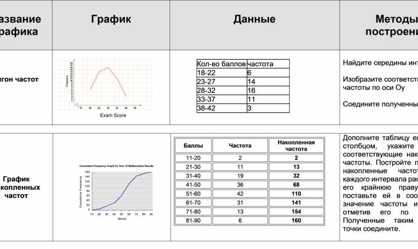 Дополните таблицу еще одним столбцом, укажите в нем соответствующие накопленные частоты. Постройте по оси Оу накопленные частоты. Для каждого интервала рассмотрите его крайнюю правую точку, поставьте ей в соответствие значение частоты интервала, отметив его по оси Оу. Полученные таким образом точки соедините.