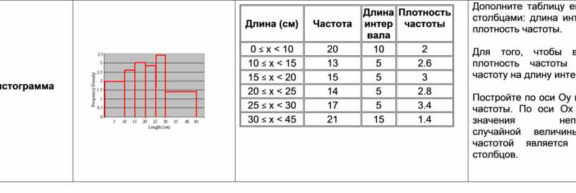 Дополните таблицу еще двумя столбцами: длина интервала и плотность частоты.