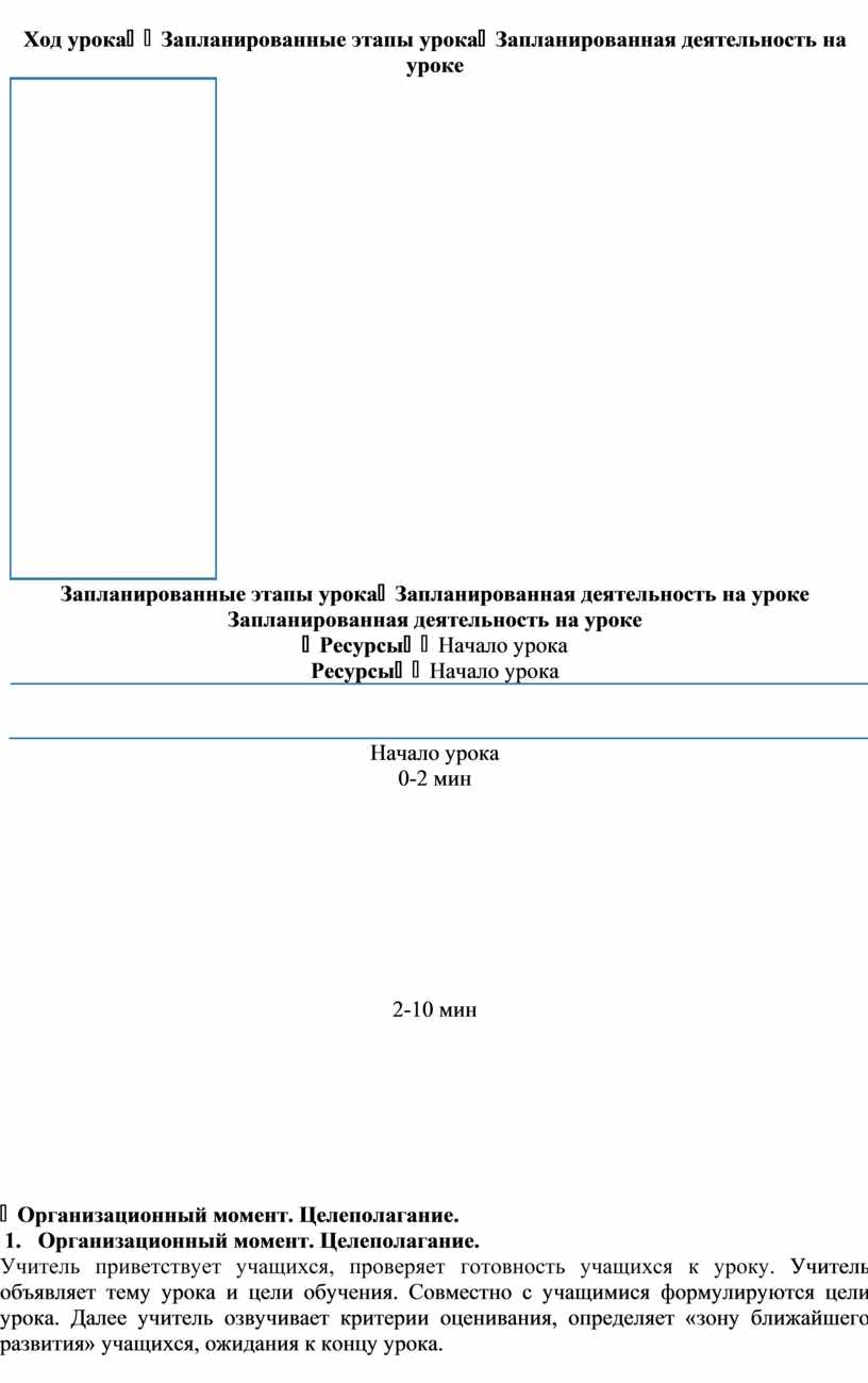 1. Организационный момент. Целеполагание. Учитель приветствует учащихся, проверяет готовность учащихся к уроку. Учитель объявляет тему урока и цели обучения. Совместно с учащимися формулируются цели урока. Далее учитель озвучивает критерии оценивания, определяет «зону ближайшего развития» учащихся, ожидания к концу урока.