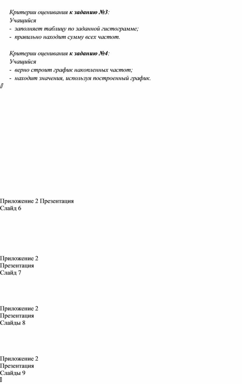 Критерии оценивания к заданию №4: Учащийся - верно строит график накопленных частот; - находит значения, используя построенный график.