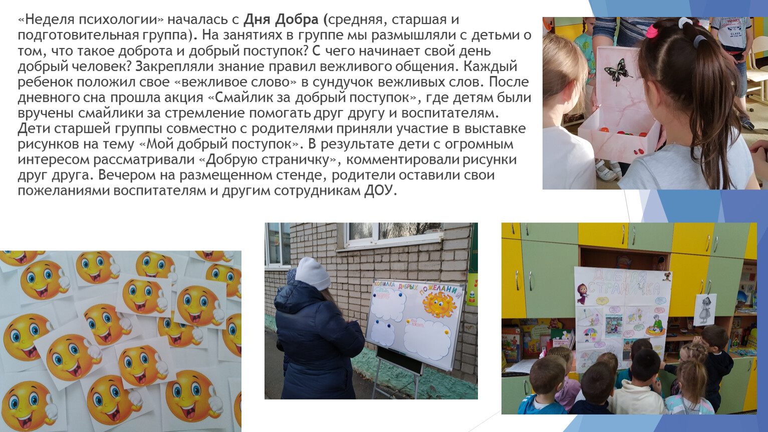 «Неделя психологии» началась с Дня Добра (средняя, старшая и подготовительная группа). На занятиях в группе мы размышляли с детьми о том, что такое доброта и добрый поступок? С чего начинает свой день добрый человек? Закрепляли знание правил вежливого общения. Каждый ребенок положил свое «вежливое слово» в сундучок вежливых слов. После дневного сна прошла акция «Смайлик за добрый поступок», где детям были вручены смайлики за стремление помогать друг другу и воспитателям. Дети старшей группы совместно с родителями приняли участие в выставке рисунков на тему «Мой добрый поступок». В результате дети с огромным интересом рассматривали «Добрую страничку», комментировали рисунки друг друга. Вечером на размещенном стенде, родители оставили свои пожеланиями воспитателям и другим сотрудникам ДОУ.