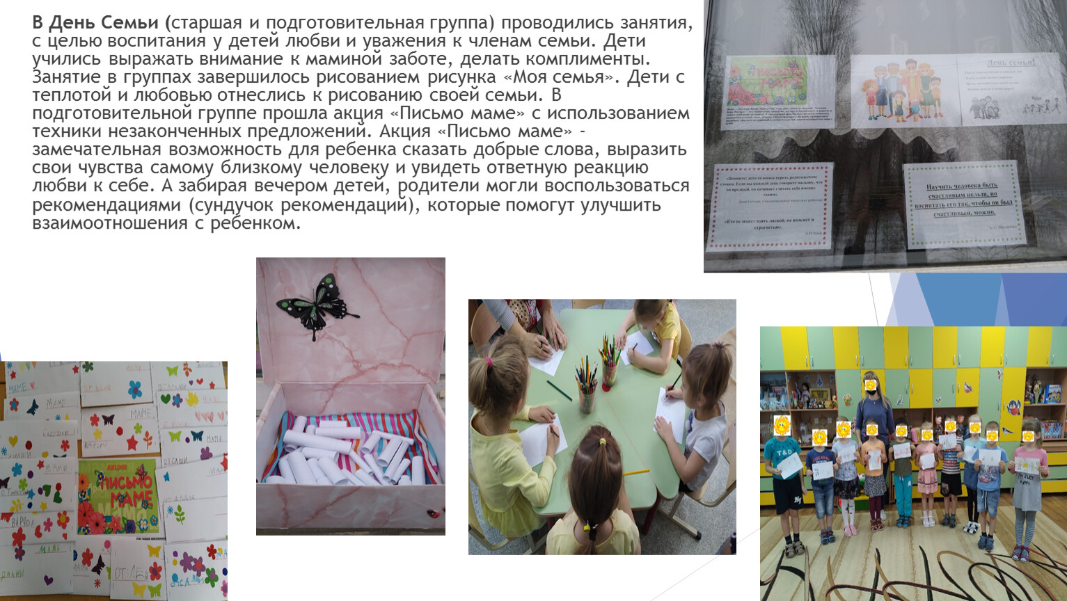В День Семьи (старшая и подготовительная группа) проводились занятия, с целью воспитания у детей любви и уважения к членам семьи. Дети учились выражать внимание к маминой заботе, делать комплименты. Занятие в группах завершилось рисованием рисунка «Моя семья». Дети с теплотой и любовью отнеслись к рисованию своей семьи. В подготовительной группе прошла акция «Письмо маме» с использованием техники незаконченных предложений. Акция «Письмо маме» - замечательная возможность для ребенка сказать добрые слова, выразить свои чувства самому близкому человеку и увидеть ответную реакцию любви к себе. А забирая вечером детей, родители могли воспользоваться рекомендациями (сундучок рекомендаций), которые помогут улучшить взаимоотношения с ребенком.