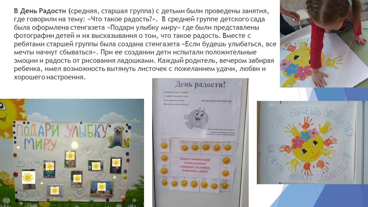 В День Радости (средняя, старшая группа) с детьми были проведены занятия, где говорили на тему: «Что такое радость?». В средней группе детского сада была оформлена стенгазета «Подари улыбку миру» где были представлены фотографии детей и их высказывания о том, что такое радость. Вместе с ребятами старшей группы была создана стенгазета «Если будешь улыбаться, все мечты начнут сбываться». При ее создании дети испытали положительные эмоции и радость от рисования ладошками. Каждый родитель, вечером забирая ребенка, имел возможность вытянуть листочек с пожеланием удачи, любви и хорошего настроения.