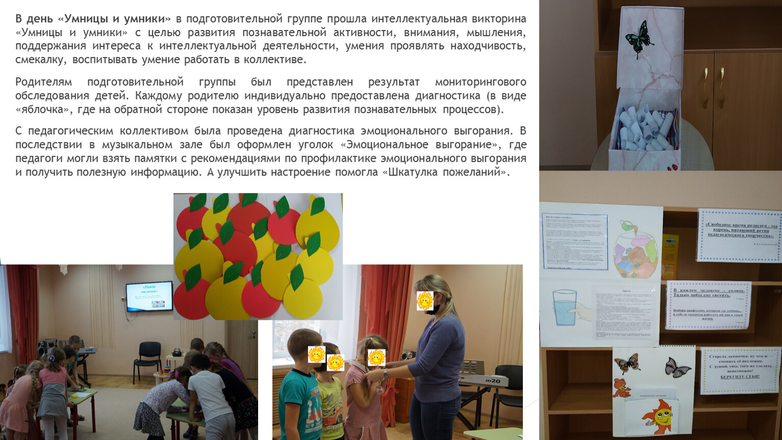 С педагогическим коллективом была проведена диагностика эмоционального выгорания. В последствии в музыкальном зале был оформлен уголок «Эмоциональное выгорание», где педагоги могли взять памятки с рекомендациями по профилактике эмоционального выгорания и получить полезную информацию. А улучшить настроение помогла «Шкатулка пожеланий».