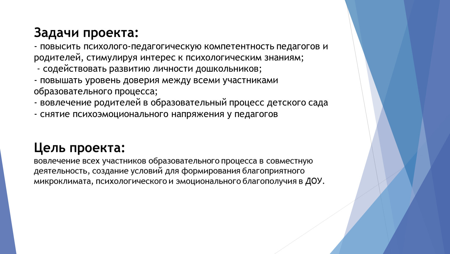 Задачи проекта: - повысить психолого-педагогическую компетентность педагогов и родителей, стимулируя интерес к психологическим знаниям; - содействовать развитию личности дошкольников; - повышать уровень доверия между всеми участниками образовательного процесса;- вовлечение родителей в образовательный процесс детского сада- снятие психоэмоционального напряжения у педагогов Цель проекта: вовлечение всех участников образовательного процесса в совместную деятельность, создание условий для формирования благоприятного микроклимата, психологического и эмоционального благополучия в ДОУ.