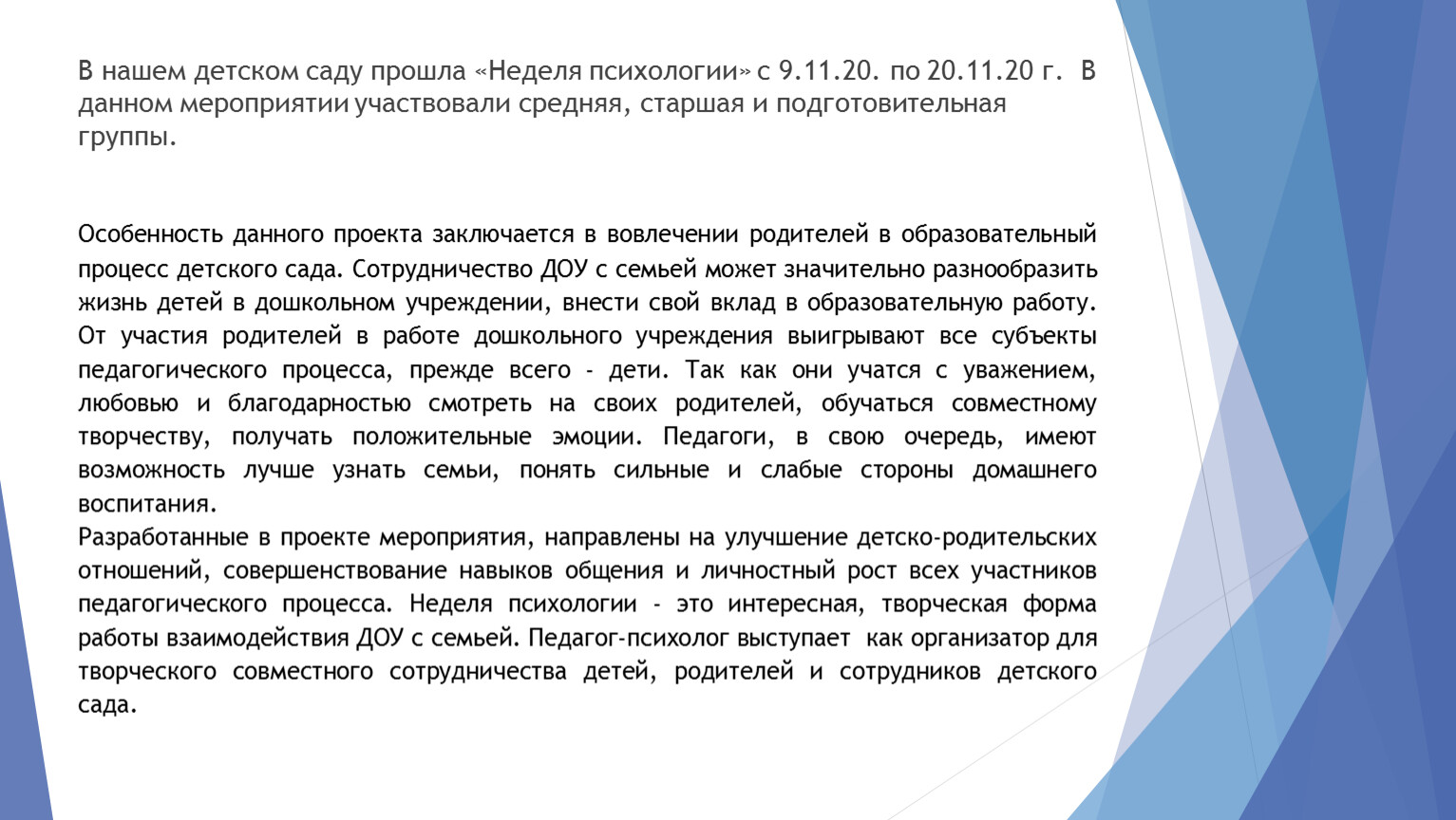Разработанные в проекте мероприятия, направлены на улучшение детско-родительских отношений, совершенствование навыков общения и личностный рост всех участников педагогического процесса. Неделя психологии - это интересная, творческая форма работы взаимодействия ДОУ с семьей. Педагог-психолог выступает как организатор для творческого совместного сотрудничества детей, родителей и сотрудников детского сада.