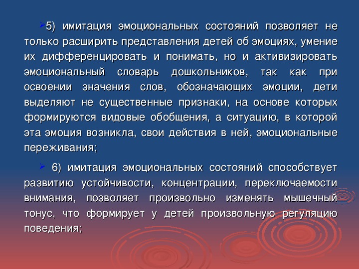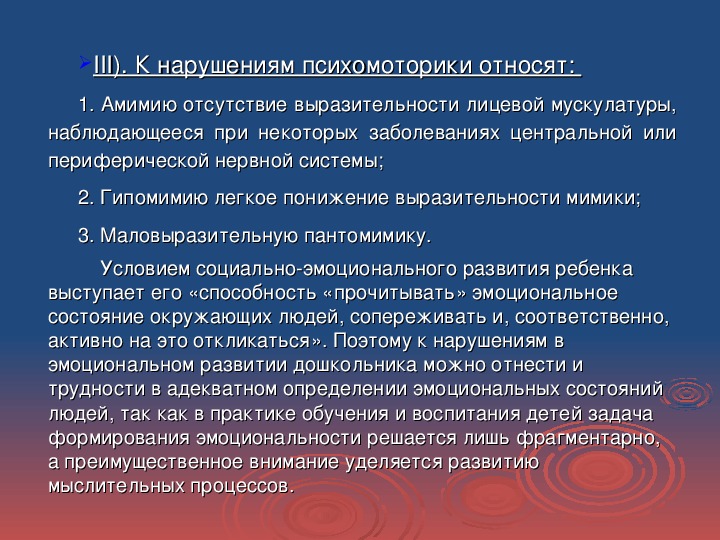 Высокая эмоциональность ребенка, которая окрашивает его психическую жизнь и практический опыт, составляет характерную особенность дошкольного детства. Внутренним, субъективным отношением ребенка к миру, к людям, к самому факту собственного существования является эмоциональное мироощущение. В одних случаях – это радость, полнота жизни, согласие с миром и самим собой, отсутствие аффективности и уходов в себя; в других – чрезмерная напряженность взаимодействия, состояние подавленности, сниженное настроение или, наоборот, выраженная агрессия.