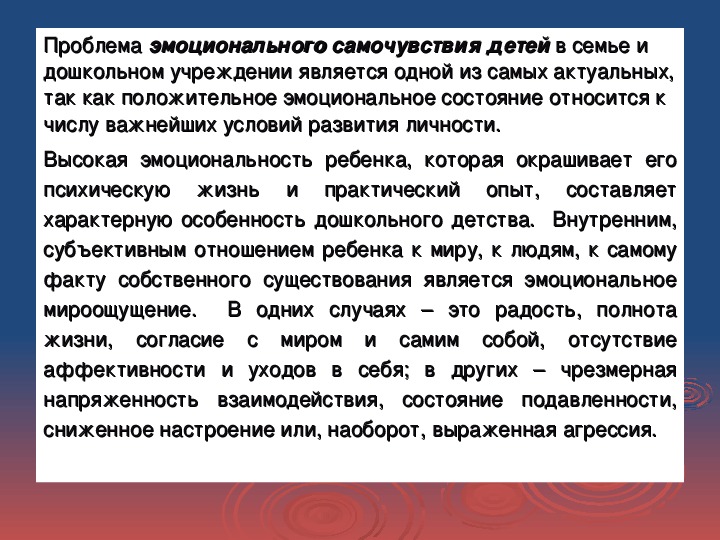 Проблема эмоционального самочувствия детей в семье и дошкольном учреждении является одной из самых актуальных, так как положительное эмоциональное состояние относится к числу важнейших условий развития личности.