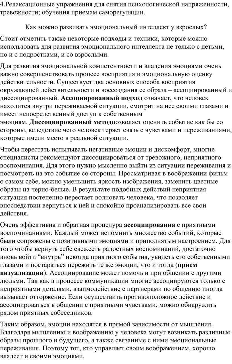 Для развития эмоциональной компетентности и владения эмоциями очень важно совершенствовать процесс восприятия и эмоциональную оценку действительности. Существует два основных способа восприятия окружающей действительности и воссоздания ее образа – ассоциированный и диссоциированный. Ассоциированный подход означает, что человек находится внутри переживаемой ситуации, смотрит на нее своими глазами и имеет непосредственный доступ к собственным эмоциям. Диссоциированный методпозволяет оценить событие как бы со стороны, вследствие чего человек теряет связь с чувствами и переживаниями, которые имели место в реальной ситуации.