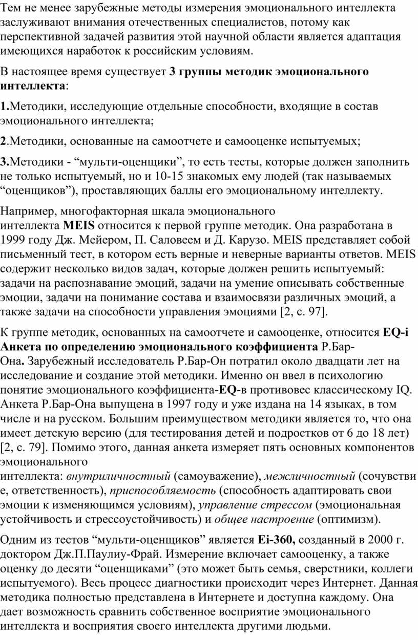 В настоящее время существует 3 группы методик эмоционального интеллекта: