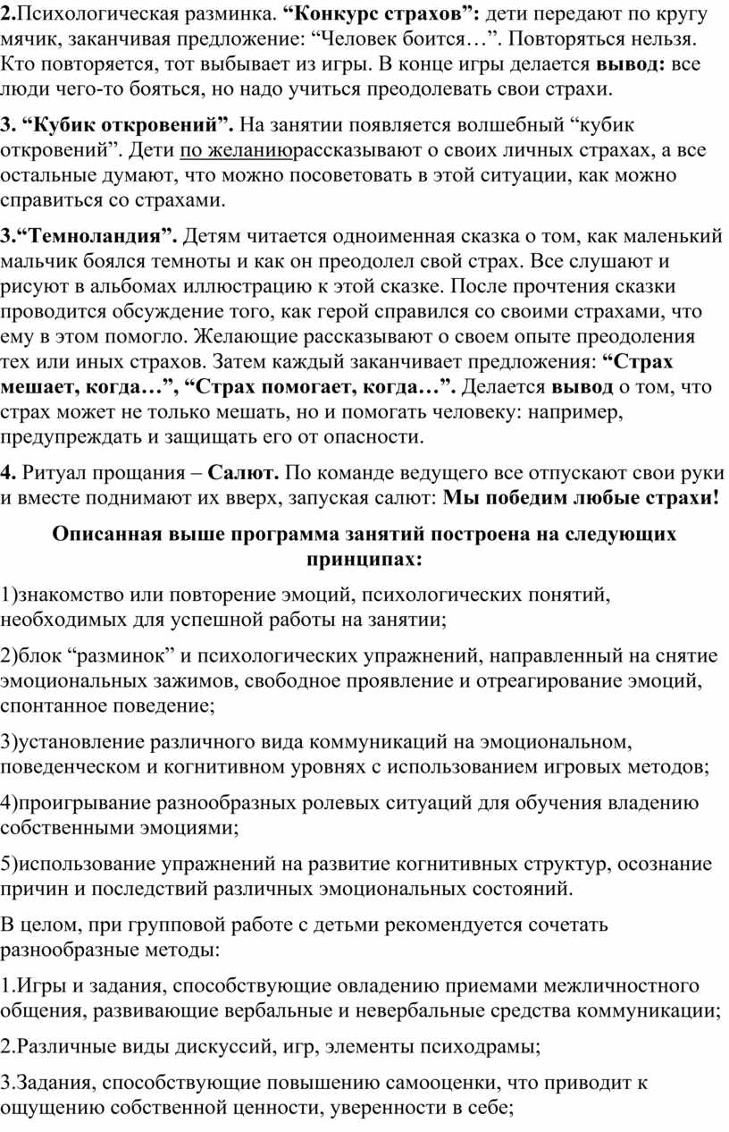2.Психологическая разминка. “Конкурс страхов”: дети передают по кругу мячик, заканчивая предложение: “Человек боится…”. Повторяться нельзя. Кто повторяется, тот выбывает из игры. В конце игры делается вывод: все люди чего-то бояться, но надо учиться преодолевать свои страхи.