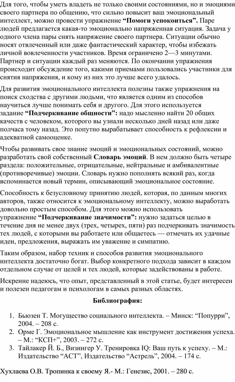 Таким образом, набор техник и способов развития эмоционального интеллекта достаточно богат. Выбор конкретного подхода зависит в каждом отдельном случае от целей и тех людей, которые задействованы в работе.
