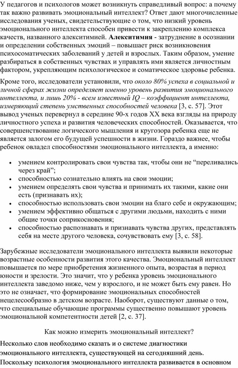 У педагогов и психологов может возникнуть справедливый вопрос: а почему так важно развивать эмоциональный интеллект? Ответ дают многочисленные исследования ученых, свидетельствующие о том, что низкий уровень эмоционального интеллекта способен привести к закреплению комплекса качеств, названного алекситимией. Алекситимия - затруднение в осознании и определении собственных эмоций – повышает риск возникновения психосоматических заболеваний у детей и взрослых. Таким образом, умение разбираться в собственных чувствах и управлять ими является личностным фактором, укрепляющим психологическое и соматическое здоровье ребенка.