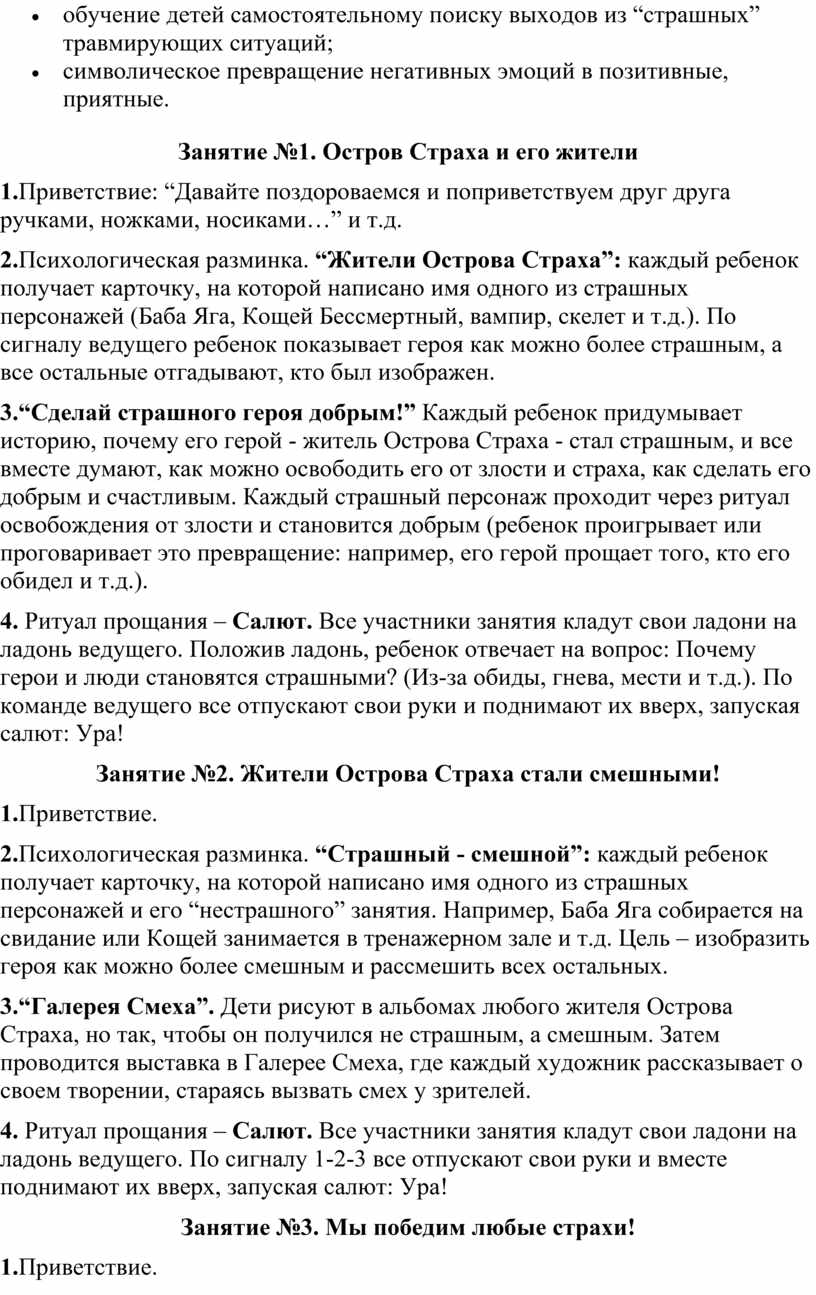 В качестве иллюстрации групповой работы с детьми, направленной на развитие их эмоционального интеллекта, предлагаю план нескольких занятий из программы “Страна эмоций”, посвященных эмоции страха.