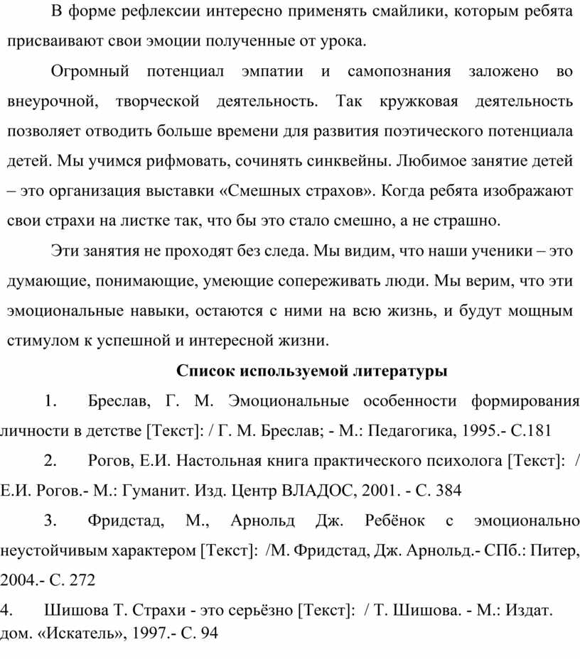 1. Бреслав, Г. М. Эмоциональные особенности формирования личности в детстве [Текст]: / Г. М. Бреслав; - М.: Педагогика, 1995.- С.181