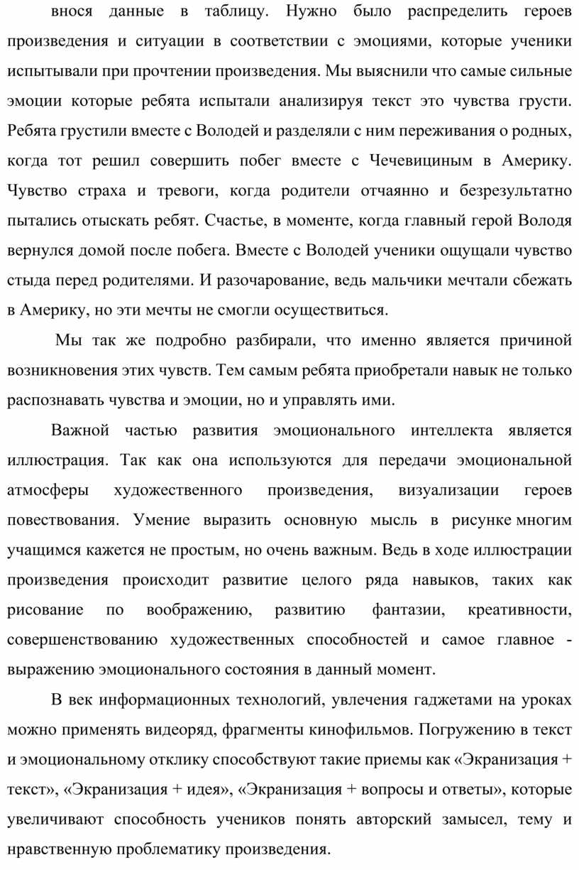 Ярким примером может стать урок литературного чтения. Ведь чтение – самый эффективный тренажер, развивающий эмоциональный интеллект и эмпатию. Так работая над анализом текста произведения А.П. Чехова «Мальчики», можно более глубоко изучать чувства, эмоции персонажей. Ученики подробно изучали каждого героя произведения, внося данные в таблицу. Нужно было распределить героев произведения и ситуации в соответствии с эмоциями, которые ученики испытывали при прочтении произведения. Мы выяснили что самые сильные эмоции которые ребята испытали анализируя текст это чувства грусти. Ребята грустили вместе с Володей и разделяли с ним переживания о родных, когда тот решил совершить побег вместе с Чечевициным в Америку. Чувство страха и тревоги, когда родители отчаянно и безрезультатно пытались отыскать ребят. Счастье, в моменте, когда главный герой Володя вернулся домой после побега. Вместе с Володей ученики ощущали чувство стыда перед родителями. И разочарование, ведь мальчики мечтали сбежать в Америку, но эти мечты не смогли осуществиться.