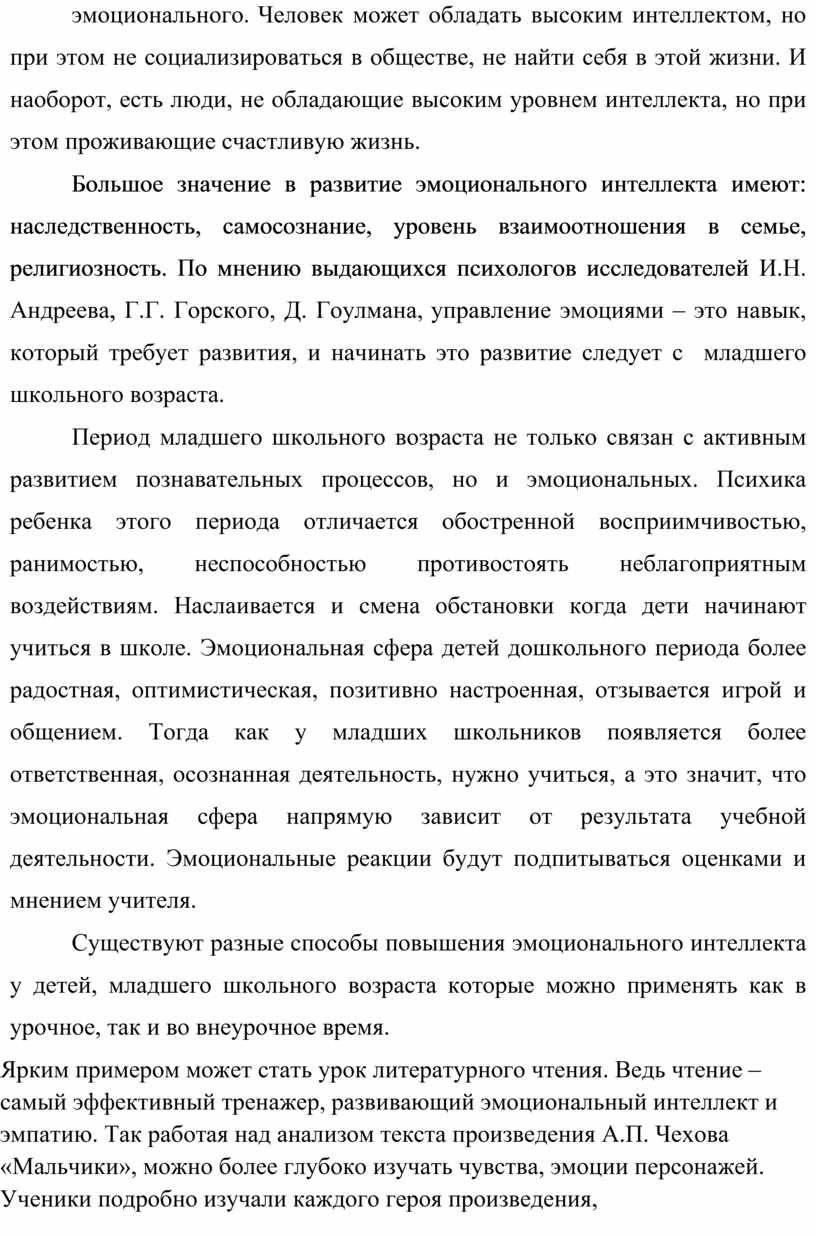 Большое значение в развитие эмоционального интеллекта имеют: наследственность, самосознание, уровень взаимоотношения в семье, религиозность. По мнению выдающихся психологов исследователей И.Н. Андреева, Г.Г. Горского, Д. Гоулмана, управление эмоциями – это навык, который требует развития, и начинать это развитие следует с младшего школьного возраста.