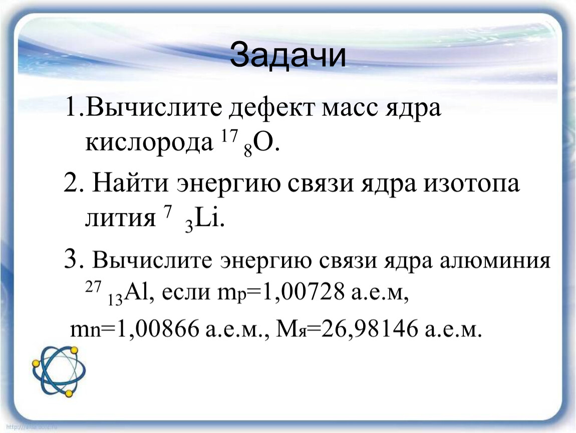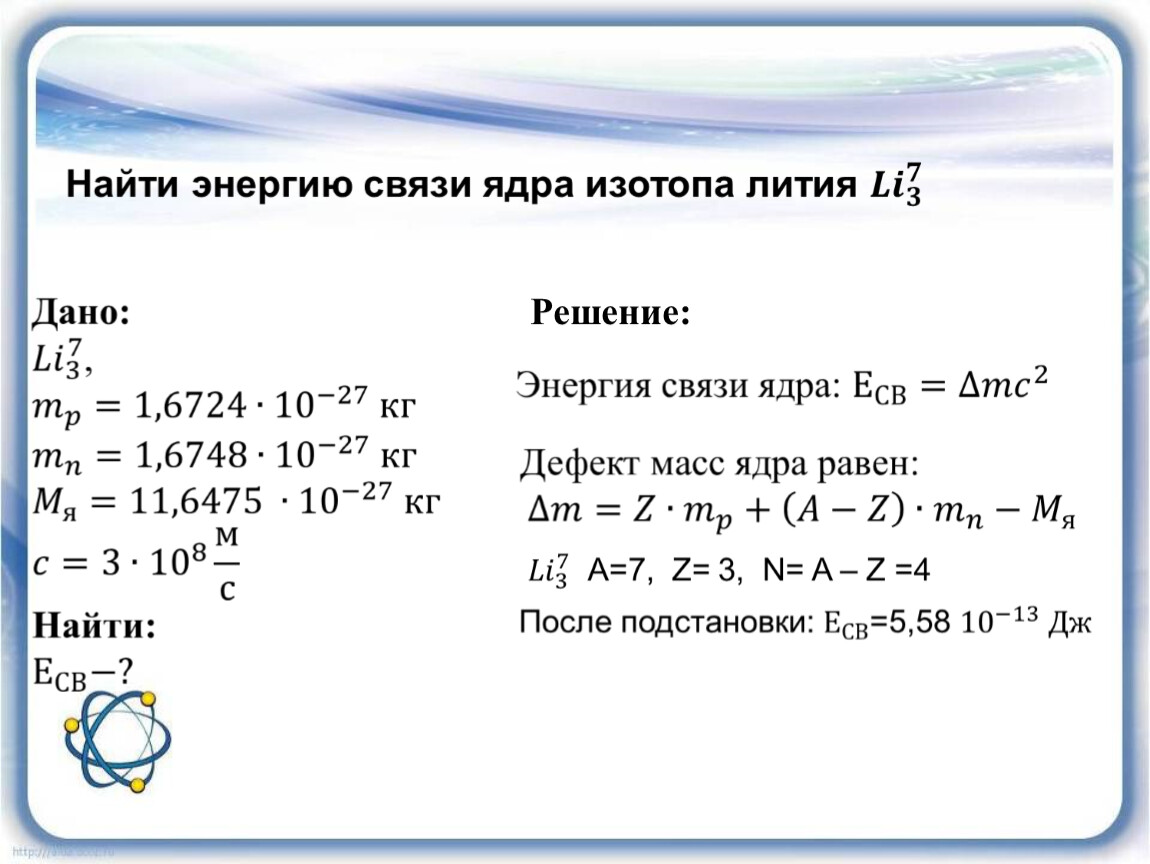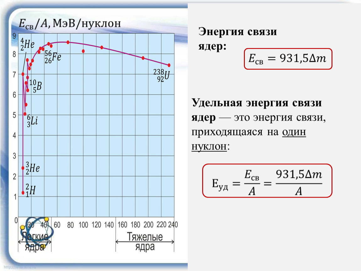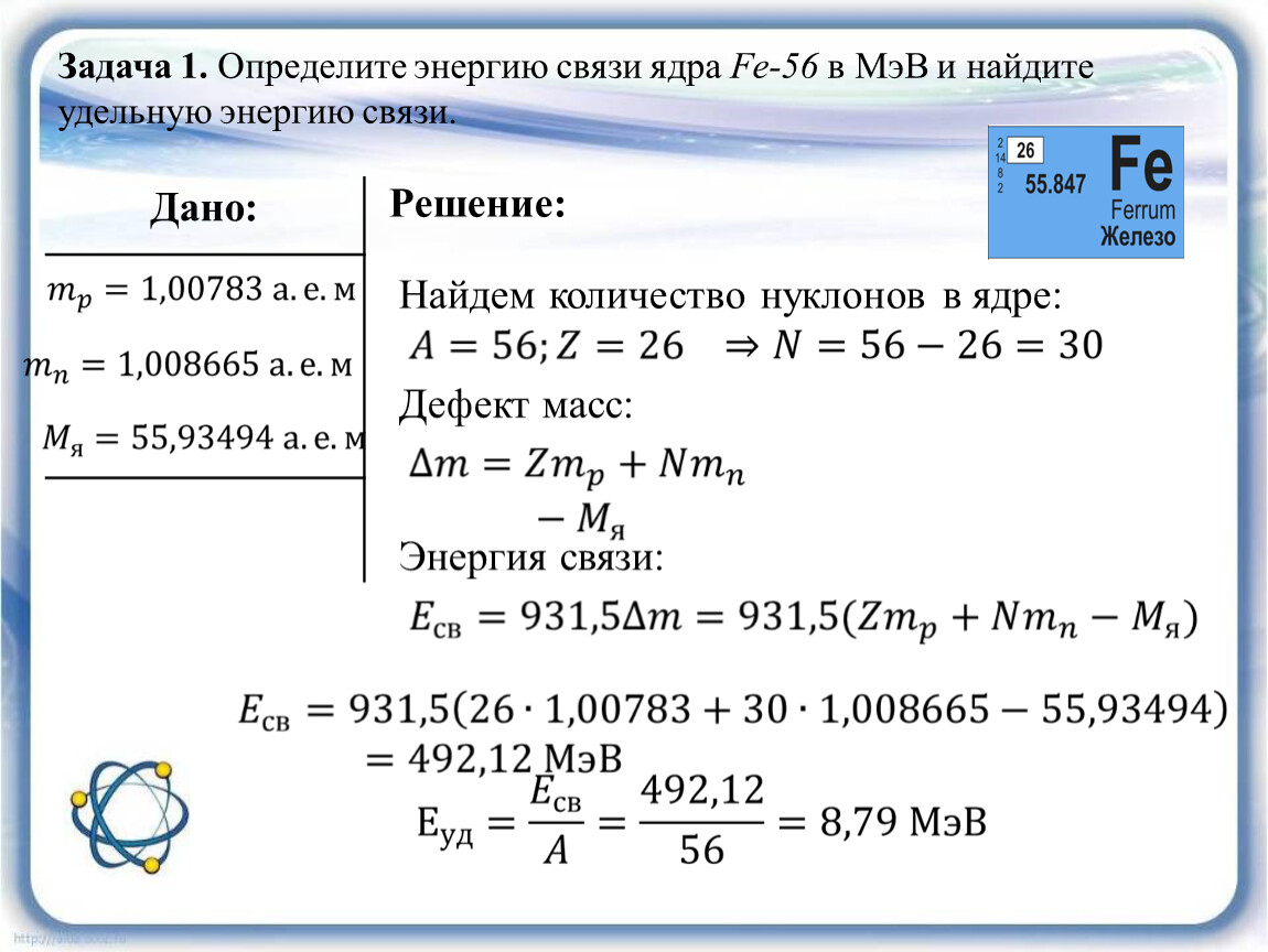 Задача 1. Определите энергию связи ядра Fe-56 в МэВ и найдите удельную энергию связи.