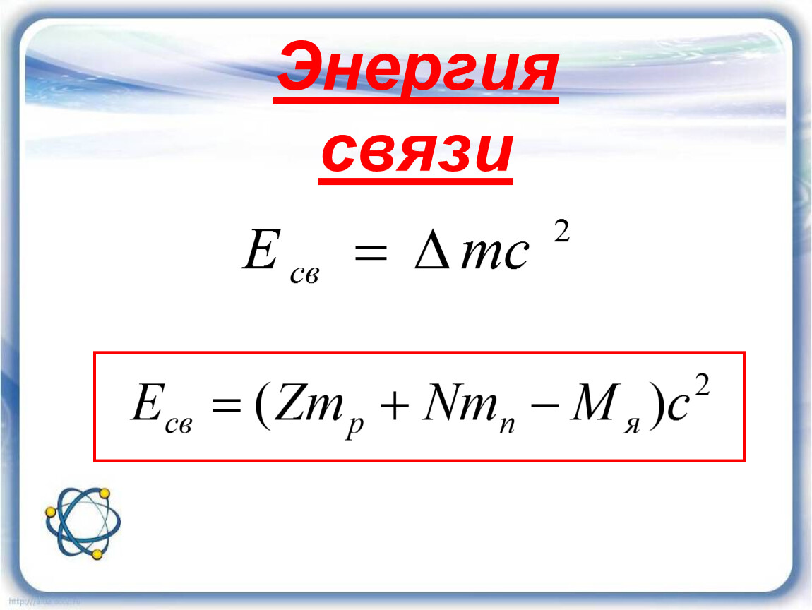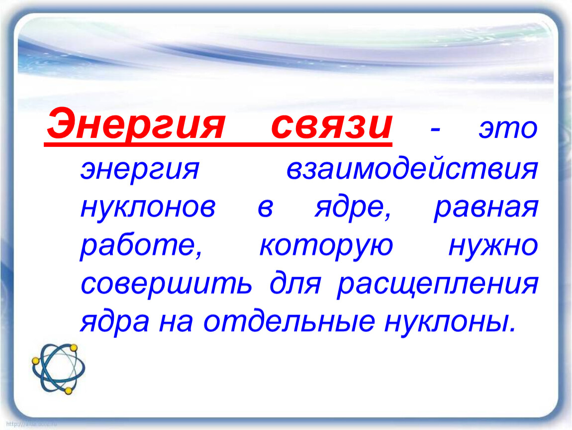 Энергия связи - это энергия взаимодействия нуклонов в ядре, равная работе, которую нужно совершить для расщепления ядра на отдельные нуклоны.