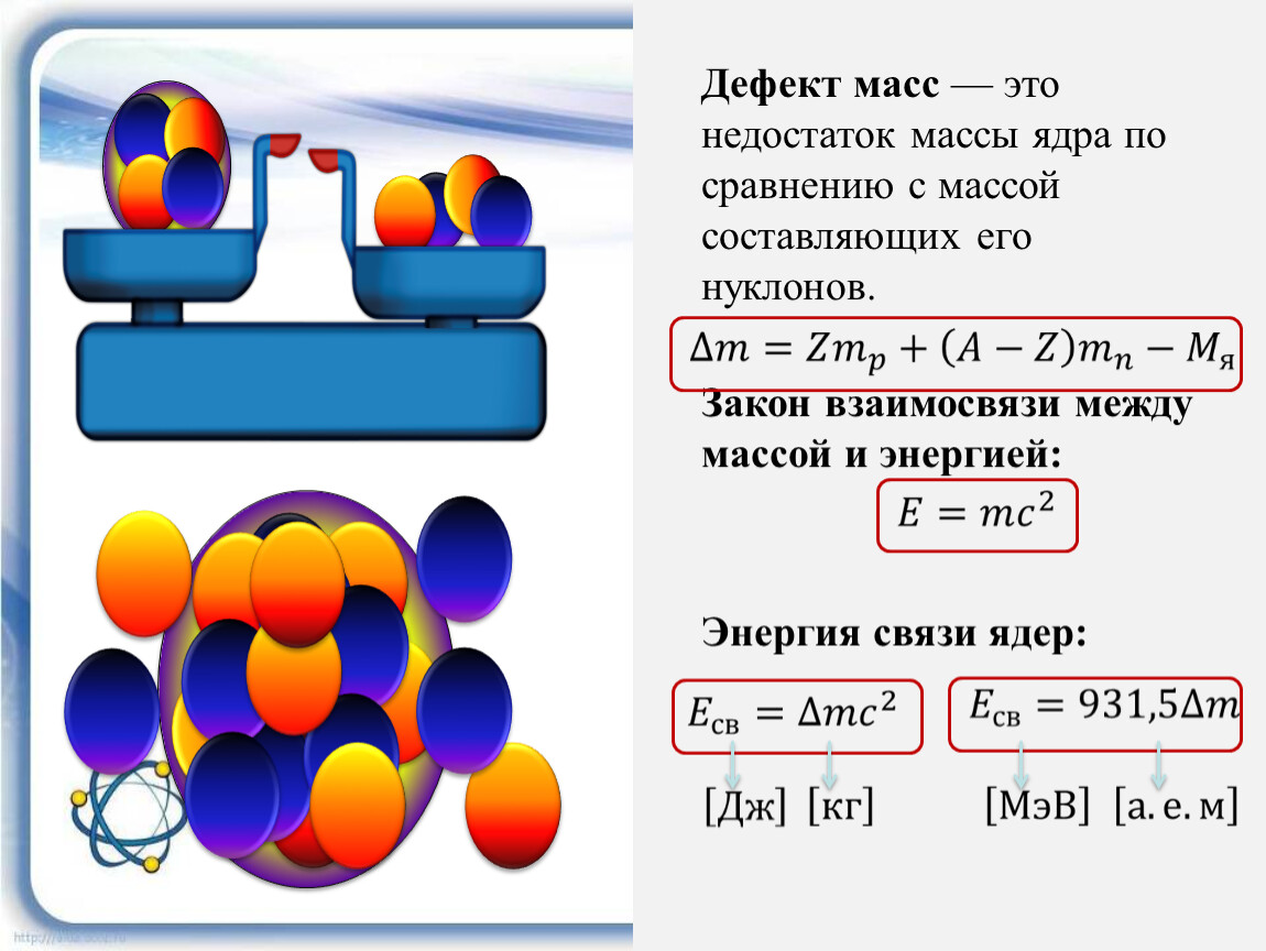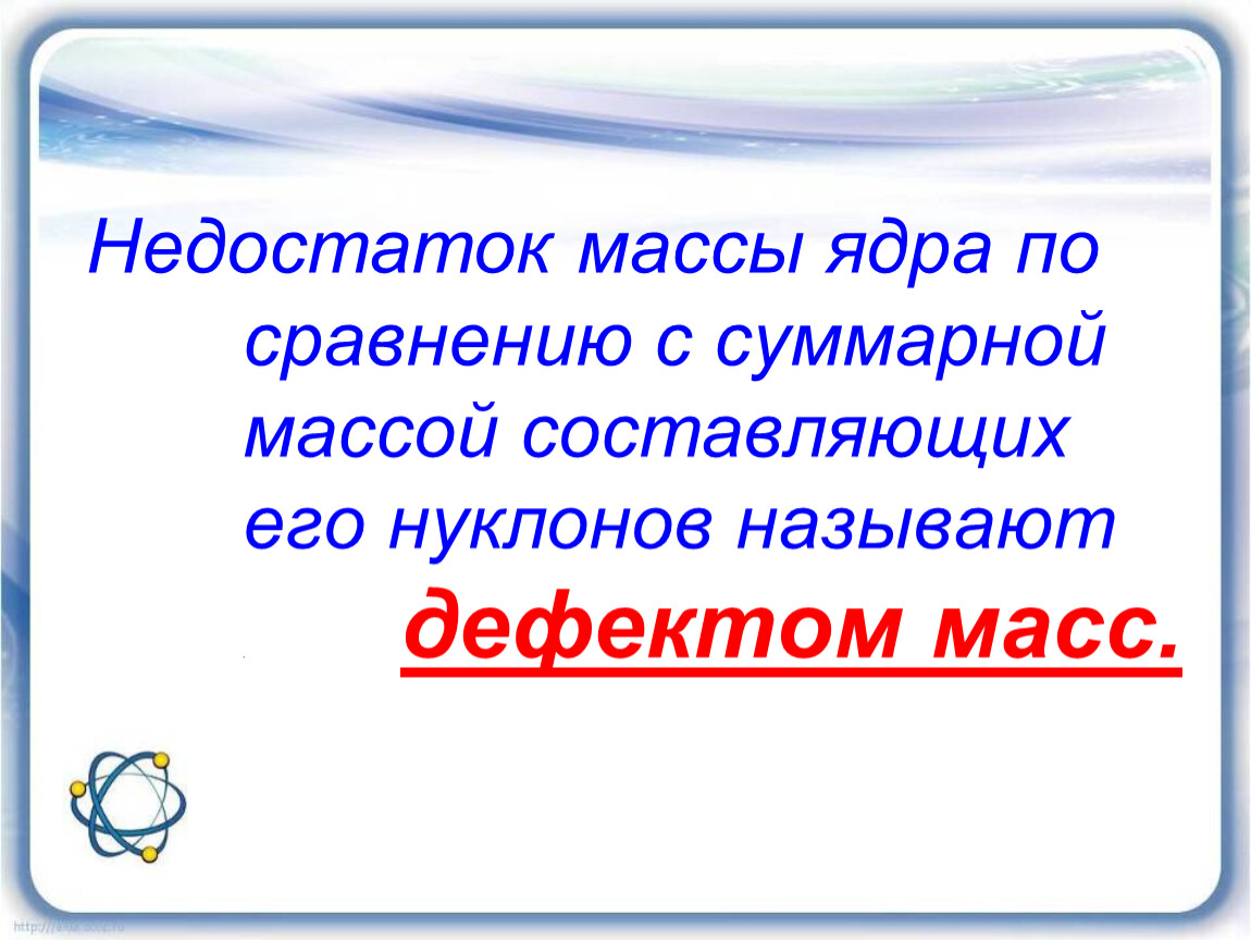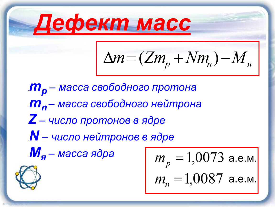 Дефект масс — это недостаток массы ядра по сравнению с массой составляющих его нуклонов.