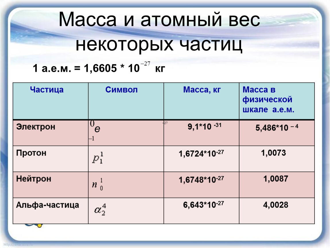 Частица | Символ | Масса, кг | Масса в физической шкале а.е.м. |