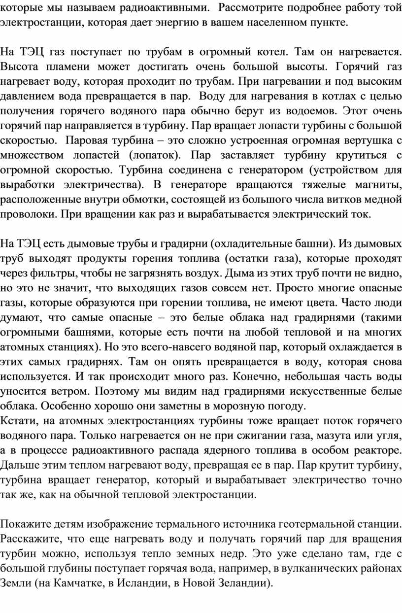 4. Откуда же берутся электричество и тепло в здании? (Выслушайте ответы детей, не комментируя.) Покажите ученикам рисунки, фотографии разных электростанций: тепловой, гидроэлектростанции, атомной электростанции. Кто из учащихся видел такие электростанции? Почему все они называются «электростанциями»? Чем они отличаются? Для получения энергии на тепловой электростанции сжигают разные виды топлива: газ, мазут, каменный уголь. Гидроэлектростанции используют энергию движения воды. На атомных станциях энергия выделяется в процессе деления особых веществ, которые мы называем радиоактивными. Рассмотрите подробнее работу той электростанции, которая дает энергию в вашем населенном пункте.