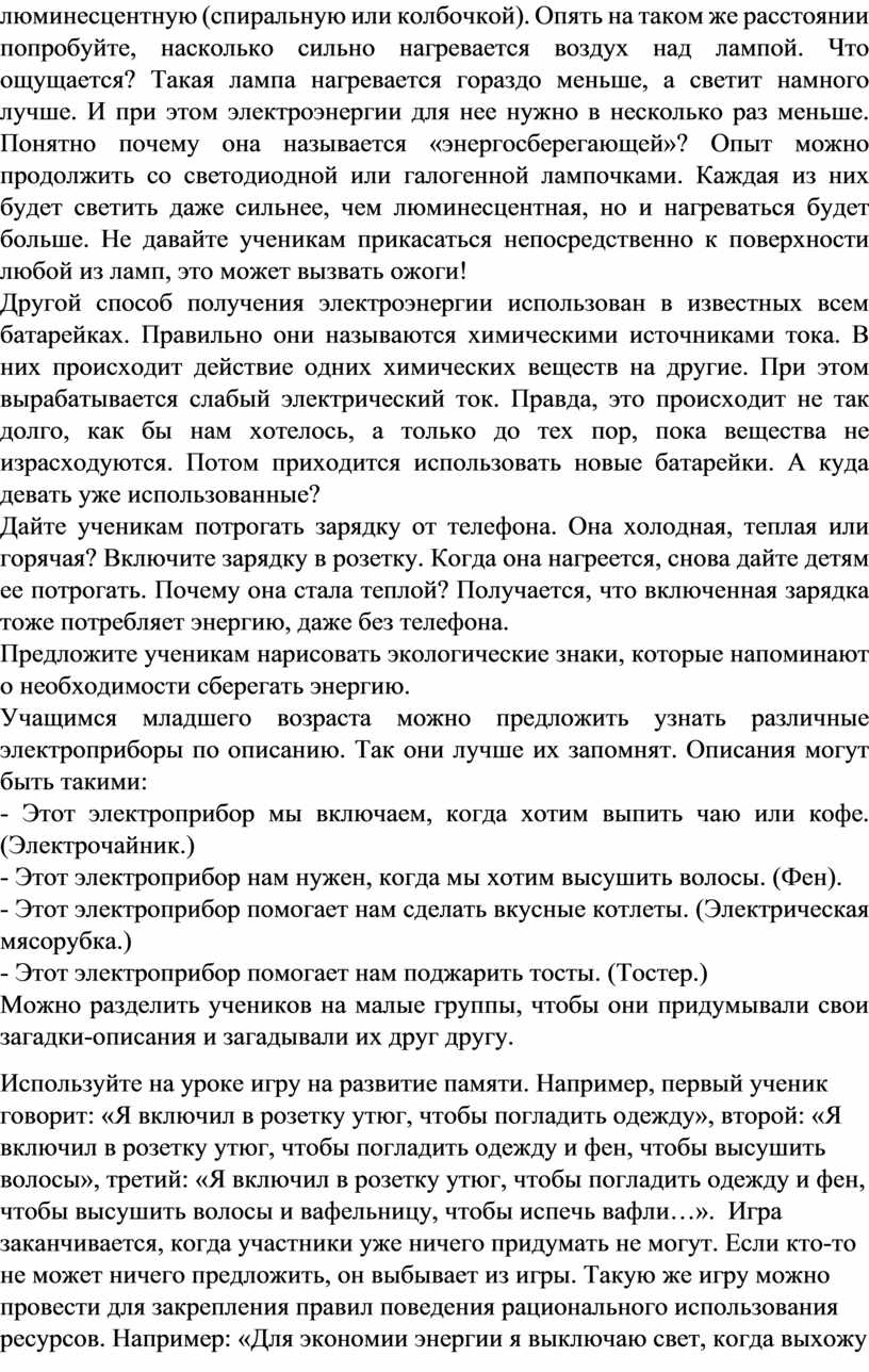 19. Используйте на уроке игру на развитие памяти. Например, первый ученик говорит: «Я включил в розетку утюг, чтобы погладить одежду», второй: «Я включил в розетку утюг, чтобы погладить одежду и фен, чтобы высушить волосы», третий: «Я включил в розетку утюг, чтобы погладить одежду и фен, чтобы высушить волосы и вафельницу, чтобы испечь вафли…». Игра заканчивается, когда участники уже ничего придумать не могут. Если кто-то не может ничего предложить, он выбывает из игры. Такую же игру можно провести для закрепления правил поведения рационального использования ресурсов. Например: «Для экономии энергии я выключаю свет, когда выхожу из комнаты», «Для экономии энергии после зарядки телефона я вынимаю зарядное устройство из розетки», «Для экономии энергии моя семья купила энергосберегающую стиральную машину», «Для экономии энергии я не открываю надолго холодильник» и т.д. Победителем будет тот, кто последним назовет варианты экономии энергии.