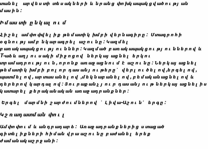 Հիշել ամփոփվելիք թեմատիկ խմբի վերնագիրը: Մտագրոհի օգնությամբ նկարագրել աշունը: Կազմել բառակապակցություններ: Կազմած բառակապակցություններով և T-աձև աղյուսակի միջոցով ներկայացնել երկու տրամադրություն, որոնք առաջացնում է աշունը: Ներկայացնել թեմատիկ խմբի բոլոր դասանյութերը՝ վերլուծելով,երգելով, պատմելով, արտասանելով ,մեկնաբանելով, բեմականացնելով և դերերով կարդալով: Յուրաքանչյուր դասանյութ ներկայացնելիս կատարել քերականական առաջադրանքներ: