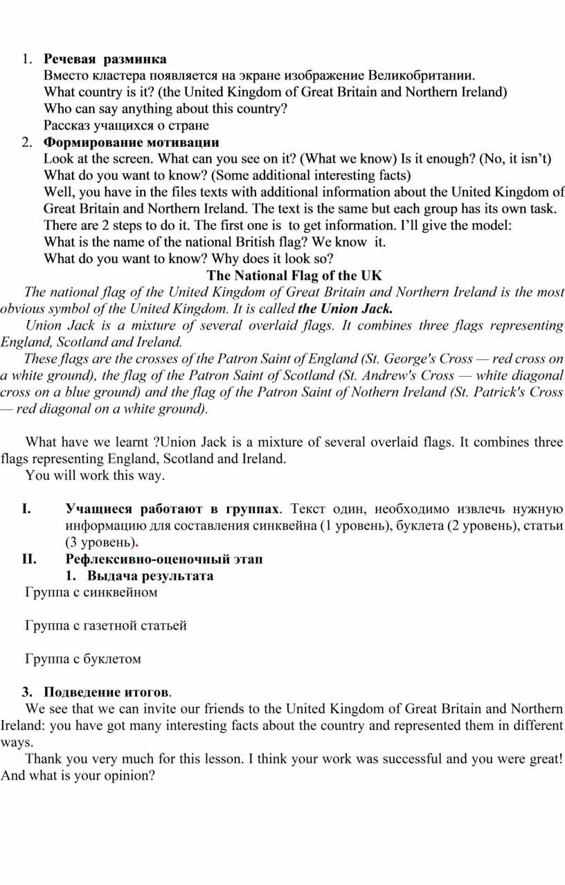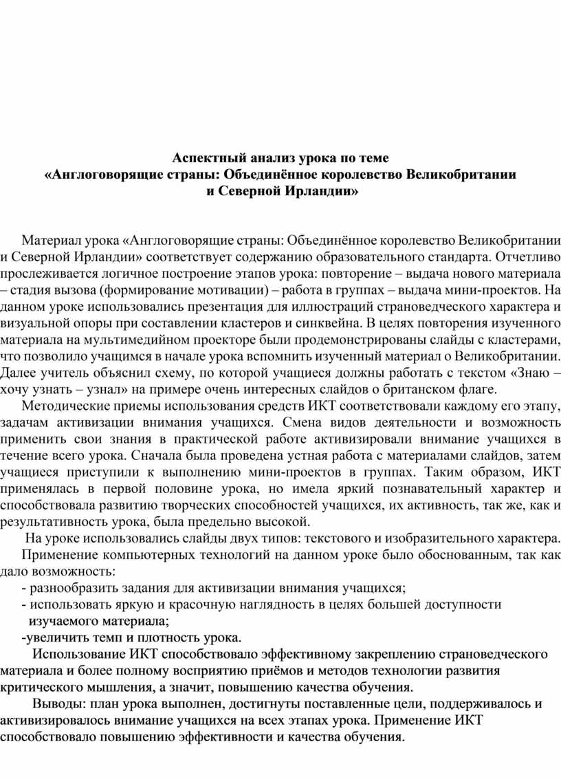 Материал урока «Англоговорящие страны: Объединённое королевство Великобритании и Северной Ирландии» соответствует содержанию образовательного стандарта. Отчетливо прослеживается логичное построение этапов урока: повторение – выдача нового материала – стадия вызова (формирование мотивации) – работа в группах – выдача мини-проектов. На данном уроке использовались презентация для иллюстраций страноведческого характера и визуальной опоры при составлении кластеров и синквейна. В целях повторения изученного материала на мультимедийном проекторе были продемонстрированы слайды с кластерами, что позволило учащимся в начале урока вспомнить изученный материал о Великобритании. Далее учитель объяснил схему, по которой учащиеся должны работать с текстом «Знаю – хочу узнать – узнал» на примере очень интересных слайдов о британском флаге.