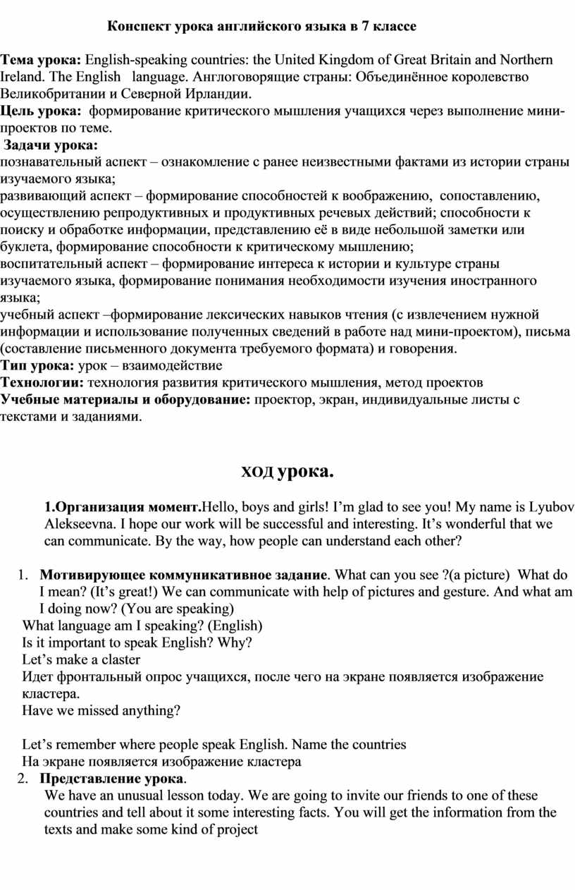 Конспект урока английского языка в 7 классе