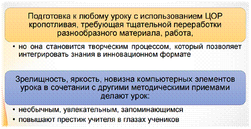 Уроки с использованием электронных образовательных ресурсов – это один из самых важных результатов инновационной работы в школе. Практически на любом школьном предмете можно применить компьютерные технологии. Педагогу необходимо найти ту грань, которая позволит сделать урок по-настоящему развивающим и познавательным. Использование электронных образовательных ресурсов позволяет осуществить задуманное, сделать урок более результативным, чем при использовании традиционных методов. Использование компьютерных технологий в процессе обучения влияет на рост профессиональной компетентности учителя, это способствует значительному повышению качества образования.