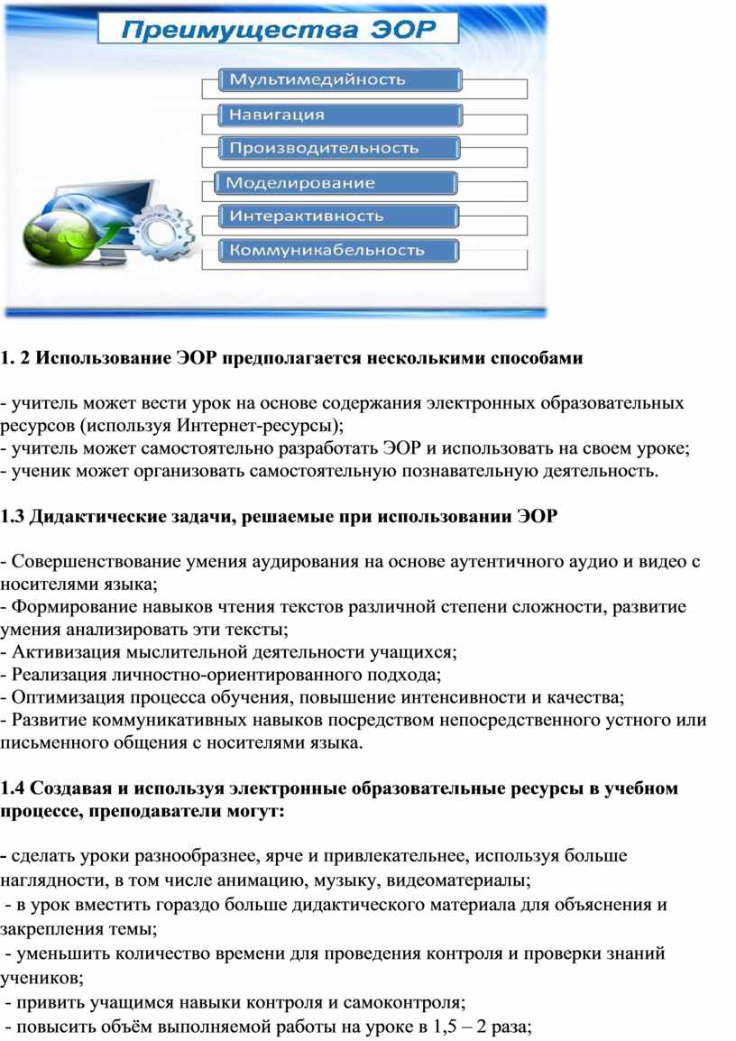 1. 2 Использование ЭОР предполагается несколькими способами