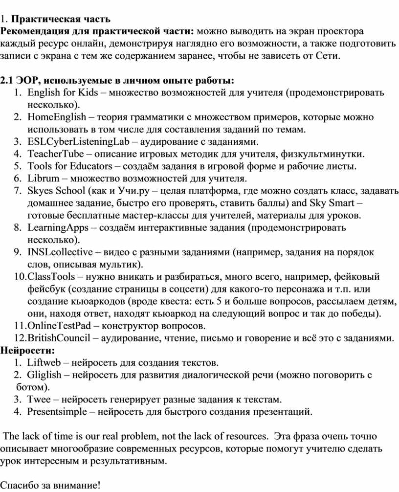 The lack of time is our real problem, not the lack of resources. Эта фраза очень точно описывает многообразие современных ресурсов, которые помогут учителю сделать урок интересным и результативным.