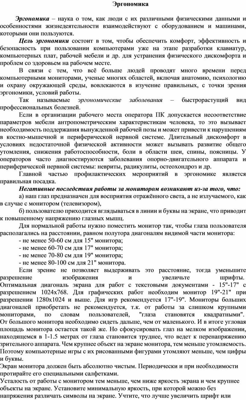 В связи с тем, что всё больше людей проводят много времени перед компьютерными мониторами, ученые многих областей, включая анатомию, психологию и охрану окружающей среды, вовлекаются в изучение правильных, с точки зрения эргономики, условий работы.