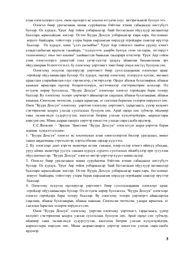 Үлэ соруктара: 1.Эрилик Эристиин “Буура Дохсун” олоҥхотун ааҕыы; 2. С.С.Яковлев