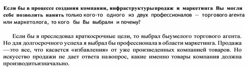 Если бы в процессе создания компании, инфраструктуры продаж и маркетинга Вы могли себе позволить нанять только кого-то одного из двух профессионалов — торгового агента или маркетолога, то кого бы Вы выбрали и почему?
