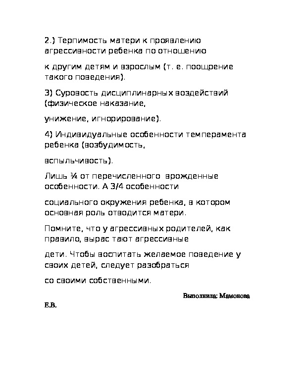 2.) Терпимость матери к проявлению агрессивности ребенка по отношению
